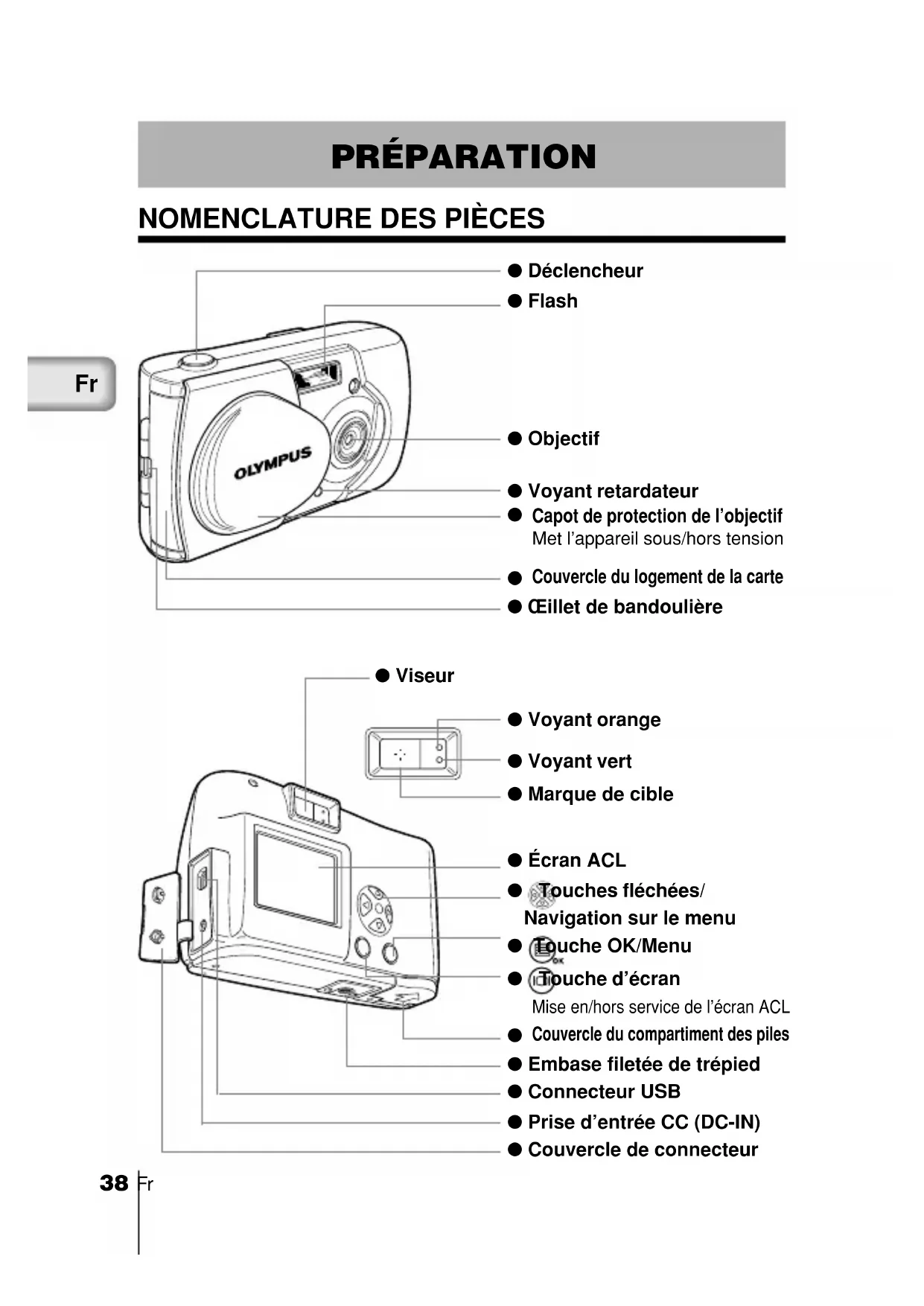Couvercle du logement de la carte ● Œillet de bandoulière ● Viseur ● Voyant orange ● Voyant vert ● Marque de cible 2/Basic02_C2-F.65E 01.8.17, 10:09 AM3839Fr
