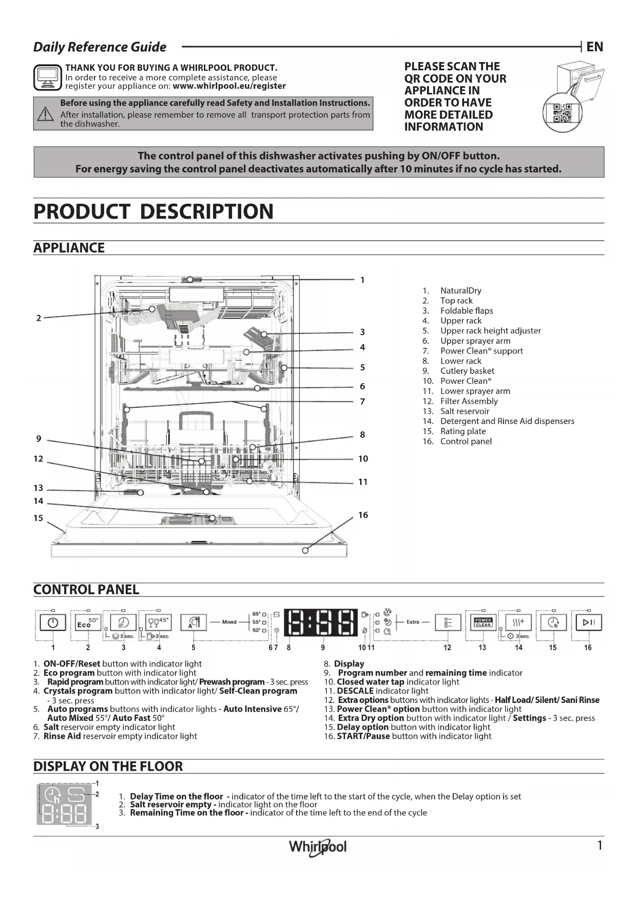 1. NaturalDry2. Panier le plus haut3. Volets pliables4. Panier supérieur5. Bouton de réglage de la hauteur du panier supérieur6. Bras d’aspersion supérieur7. Supports Power Clean®8. Panier inférieur9. Panier à couvert10. Power Clean®11. Bras d’aspersion inférieur12. Ensemble filtre13. Réservoir à sel14. Distributeurs de détergent et liquide de rinçage15. Plaque signalétique16. Panneau de commande
