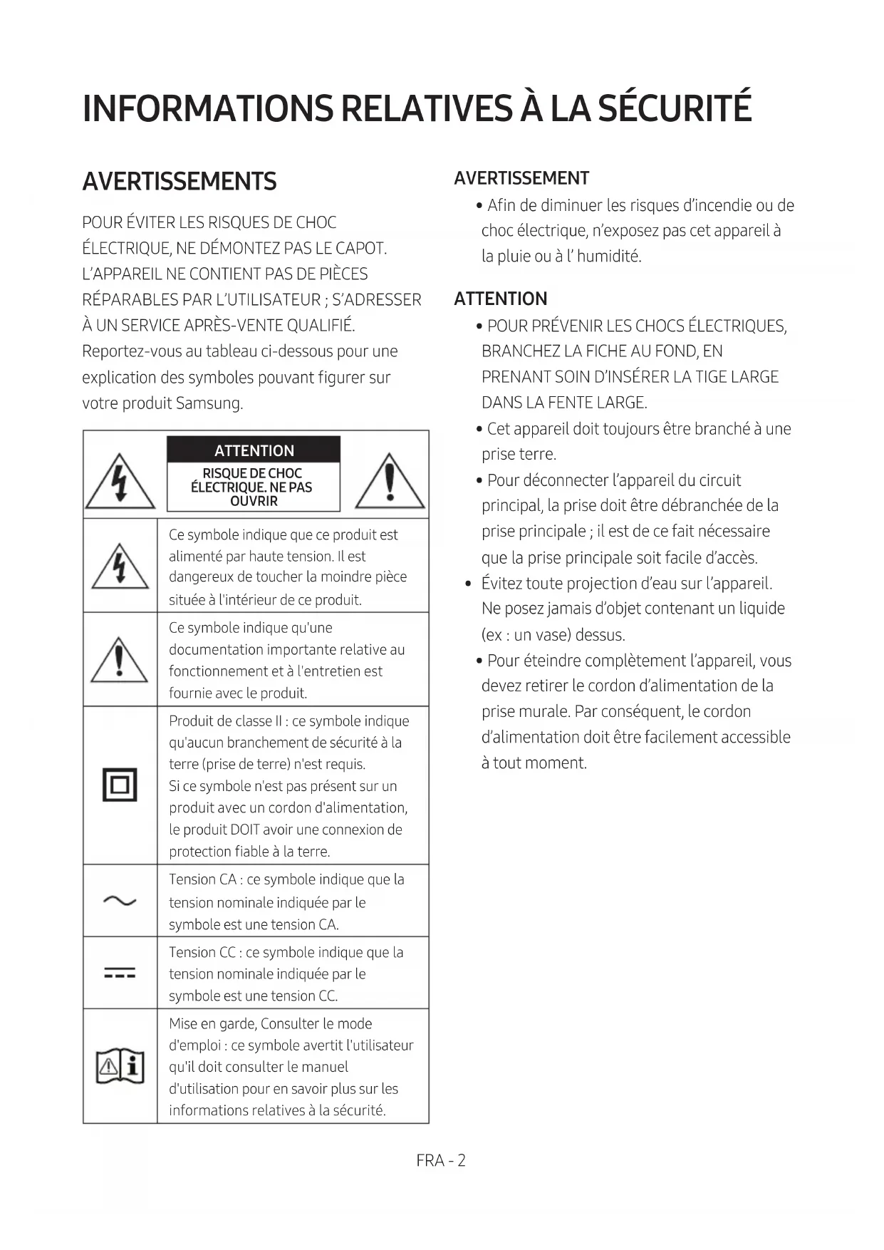 ÉLECTRIQUE, NE DÉMONTEZ PAS LE CAPOT. L’APPAREIL NE CONTIENT PAS DE PIÈCES RÉPARABLES PAR L’UTILISATEUR ; S’ADRESSER À UN SERVICE APRÈS-VENTE QUALIFIÉ. Reportez-vous au tableau ci-dessous pour une explication des symboles pouvant gurer sur votre produit Samsung. ATTENTION RISQUE DE CHOC ÉLECTRIQUE. NE PAS OUVRIRCe symbole indique que ce produit est alimenté par haute tension. Il est dangereux de toucher la moindre pièce située à l'intérieur de ce produit.Ce symbole indique qu'une documentation importante relative au fonctionnement et à l'entretien est fournie avec le produit.Produit de classeII: ce symbole indique qu'aucun branchement de sécurité à la terre (prise de terre) n'est requis. Si ce symbole n'est pas présent sur un produit avec un cordon d'alimentation, le produit DOIT avoir une connexion de protection able à la terre.Tension CA: ce symbole indique que la tension nominale indiquée par le symbole est une tension CA.Tension CC: ce symbole indique que la tension nominale indiquée par le symbole est une tension CC.Mise en garde, Consulter le mode d'emploi: ce symbole avertit l'utilisateur qu'il doit consulter le manuel d'utilisation pour en savoir plus sur les informations relatives à la sécurité. AVERTISSEMENT