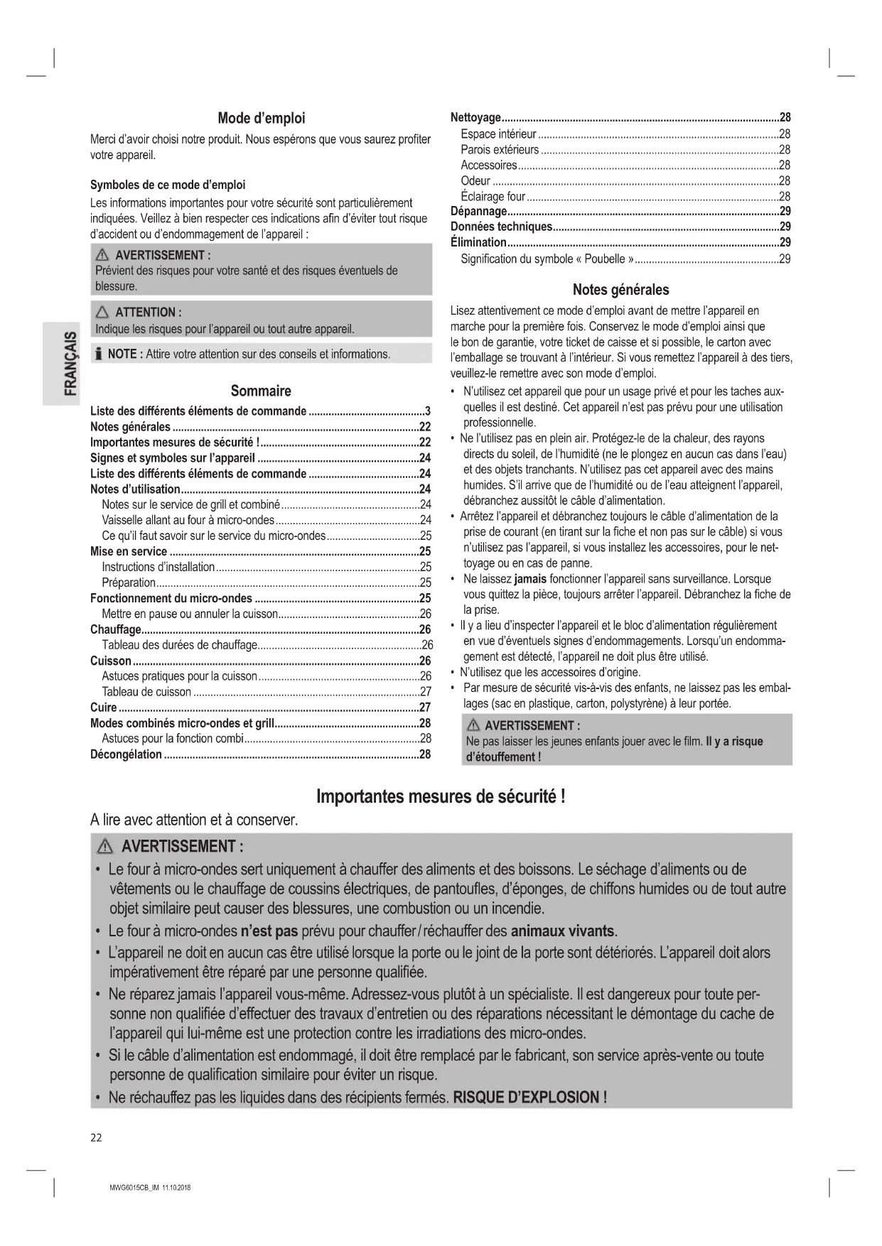 Dépannage Une défaillance est souvent due à de légers problèmes. Avant de contacter notre service à la clientèle, veuillez vérier le tableau ci-dessous : Problèmes Origine possible Note / solution La réception radio ou TV s’interrompt pendant que le micro-ondes fonctionne. Le champ électromagnétique de l’appareil peut interférer avec les images et les sons de fréquences particulières. Cette situation est normale et ne résulte pas d’une défaillance. Éloignez les appareils. Le micro-ondes ne s’allume pas. La porte n’est pas correctement fermée. Vériez si des objets ou des restes d’aliments sont coincés dans la porte. Défaut de la prise murale. Essayez une autre prise murale. Vériez le fusible principal de votre habitation. Le plateau tournant provoque un bruit abrasant ou de grattement. Présence d’objets étrangers ou sales vers la pièce du plateau tournant. Retirez d’éventuels objets et des restes d’aliments comme il est décrit dans le chapitre « Nettoyage ». L’appareil s’est arrêté de fonctionner sans raison apparente. L’appareil est défectueux. Veuillez contacter notre service à la clientèle. Données techniques Modèle : ................................................................................MWG 6015 CB Alimentation : .......................................................................... 230 V~, 50 Hz Consommation : Micro-ondes : ................................................................................. 1150 W Gril : ................................................................................................ 800 W Puissance micro-ondes : ..................................................700 W / 2450 MHz Volume du four : ........................................................................ env. 20 litres Classe de protection : .................................................................................. Poids net : ...................................................................................env. 11,4 kg Nous nous réservons le droit d’apporter des modications techniques ainsi que des modications de conception dans le cadre du développe- ment continu de nos produits. Cet appareil a été contrôlé d’après toutes les directives européennes actuelles applicables, comme par exemple concernant la compatibilité électromagnétique et la basse tension. Cet appareil a été fabriqué en respect des réglementations techniques de sécurité les plus récentes. Élimination Signication du symbole « Poubelle » Protégez votre environnement, ne jetez pas vos appareils élec- triques avec les ordures ménagères. Utilisez, pour l’élimination de vos appareils électriques, les bornes de collecte prévues à cet effet où vous pouvez vous débarrasser des appareils que vous n’utilisez plus. Vous contribuez ainsi à éviter les impacts potentiels dans l’environnement et sur la santé de chacun, causés par une mauvaise élimination de ces déchets. Vous contribuez aussi au recyclage sous toutes ses formes des appareils électriques et électroniques usagés. Vous trouverez toutes les informations sur les bornes d’élimination des appareils auprès de votre commune ou de l’administration de votre com- munauté.30