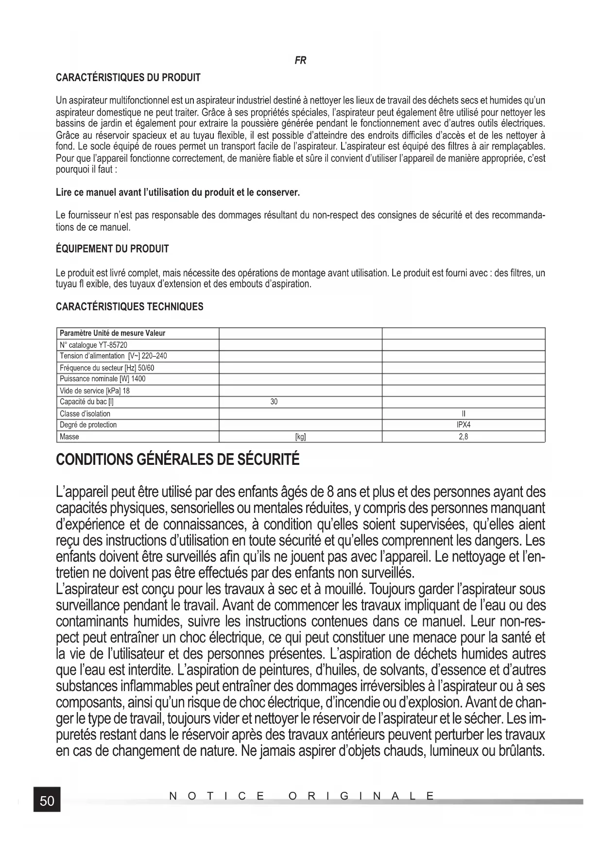 Paramètre Unité de mesure Valeur N° catalogue YT-85720 Tension d’alimentation [V~] 220–240 Fréquence du secteur [Hz] 50/60 Puissance nominale [W] 1400 Vide de service [kPa] 18 Capacité du bac [l] 30 Classe d’isolation II Degré de protection IPX4 Masse [kg] 2,8 CONDITIONS GÉNÉRALES DE SÉCURITÉ L’appareil peut être utilisé par des enfants âgés de 8 ans et plus et des personnes ayant des capacités physiques, sensorielles ou mentales réduites, y compris des personnes manquant d’expérience et de connaissances, à condition qu’elles soient supervisées, qu’elles aient reçu des instructions d’utilisation en toute sécurité et qu’elles comprennent les dangers. Les enfants doivent être surveillés afi n qu’ils ne jouent pas avec l’appareil. Le nettoyage et l’en- tretien ne doivent pas être eff ectués par des enfants non surveillés. L’aspirateur est conçu pour les travaux à sec et à mouillé. Toujours garder l’aspirateur sous surveillance pendant le travail. Avant de commencer les travaux impliquant de l’eau ou des contaminants humides, suivre les instructions contenues dans ce manuel. Leur non-res- pect peut entraîner un choc électrique, ce qui peut constituer une menace pour la santé et la vie de l’utilisateur et des personnes présentes. L’aspiration de déchets humides autres que l’eau est interdite. L’aspiration de peintures, d’huiles, de solvants, d’essence et d’autres substances infl ammables peut entraîner des dommages irréversibles à l’aspirateur ou à ses composants, ainsi qu’un risque de choc électrique, d’incendie ou d’explosion. Avant de chan- ger le type de travail, toujours vider et nettoyer le réservoir de l’aspirateur et le sécher. Les im- puretés restant dans le réservoir après des travaux antérieurs peuvent perturber les travaux en cas de changement de nature. Ne jamais aspirer d’objets chauds, lumineux ou brûlants.51