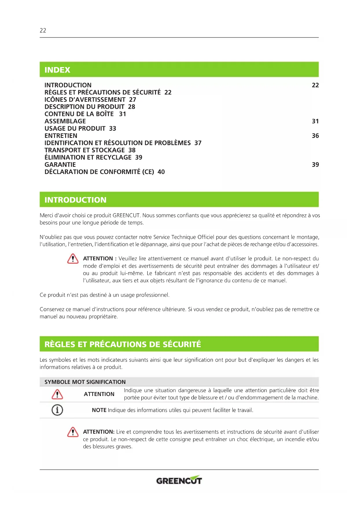- Directiva 2012/46/UE de la Comisión, de 6 de diciembre de 2012 , por la que se modica la Directiva 97/68/CE del Parlamento Europeo y del Consejo, relativa a la aproximación de las legislaciones de los Estados miembros sobre medidas contra la emisión de gases y partículas contaminantes procedentes de los motores de combustión interna que se instalen en las máquinas móviles no de carretera. Normas armonizadas: EN ISO 11681-1:2011, EN ISO 11681-2:2011, EN 55012:2007+A1:2009, EN 61000-6-1:2007 El producto entregado coincide con el ejemplar que fue sometido al examen CE de tipo. Valls, 1 de julio de 2019, Albert Prat Asensio, CEO (Representante autorizado y responsable de la documentación técnica).22 INTRODUCTION Merci d’avoir choisi ce produit GREENCUT. Nous sommes conants que vous apprécierez sa qualité et répondrez à vos besoins pour une longue période de temps. N’oubliez pas que vous pouvez contacter notre Service Technique Ofciel pour des questions concernant le montage, l’utilisation, l’entretien, l’identication et le dépannage, ainsi que pour l’achat de pièces de rechange et/ou d’accessoires. ATTENTION : Veuillez lire attentivement ce manuel avant d’utiliser le produit. Le non-respect du mode d’emploi et des avertissements de sécurité peut entraîner des dommages à l’utilisateur et/ ou au produit lui-même. Le fabricant n’est pas responsable des accidents et des dommages à l’utilisateur, aux tiers et aux objets résultant de l’ignorance du contenu de ce manuel. Ce produit n’est pas destiné à un usage professionnel. Conservez ce manuel d’instructions pour référence ultérieure. Si vous vendez ce produit, n’oubliez pas de remettre ce manuel au nouveau propriétaire. RÈGLES ET PRÉCAUTIONS DE SÉCURITÉ Les symboles et les mots indicateurs suivants ainsi que leur signication ont pour but d’expliquer les dangers et les informations relatives à ce produit. ATTENTION: Lire et comprendre tous les avertissements et instructions de sécurité avant d’utiliser ce produit. Le non-respect de cette consigne peut entraîner un choc électrique, un incendie et/ou des blessures graves.