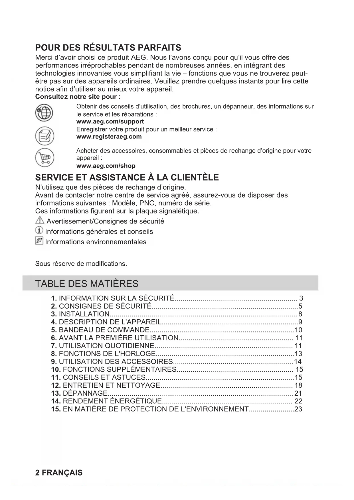 N’utilisez que des pièces de rechange d’origine. Avant de contacter notre centre de service agréé, assurez-vous de disposer des informations suivantes : Modèle, PNC, numéro de série. Ces informations figurent sur la plaque signalétique. Avertissement/Consignes de sécurité Informations générales et conseils Informations environnementales Sous réserve de modifications.