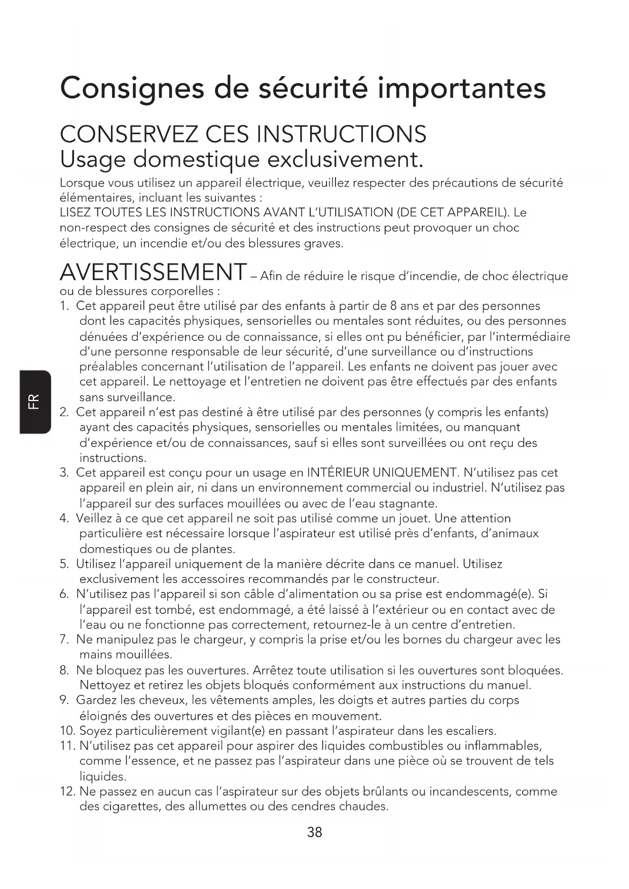 LISEZ TOUTES LES INSTRUCTIONS AVANT L'UTILISATION (DE CET APPAREIL). Le non-respect des consignes de sécurité et des instructions peut provoquer un choc électrique, un incendie et/ou des blessures graves.