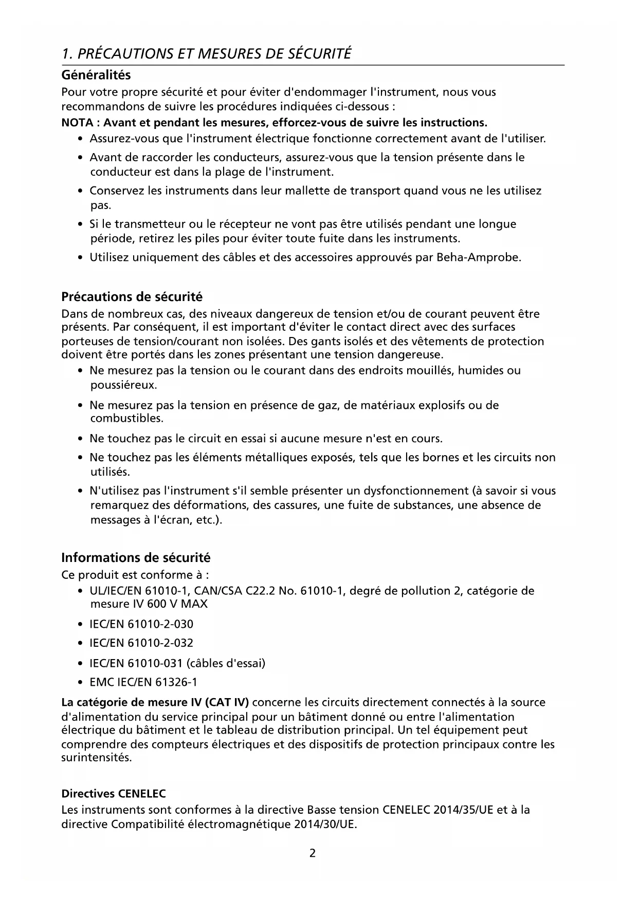 - EMC IEC/EN 61326-1 La catégorie de mesure IV (CAT IV) concerne les circuits directement connectés à la source d'alimentation du service principal pour un bâtiment donné ou entre l'alimentation électrique du bâtiment et le tableau de distribution principal. Un tel équipement peut comprendre des compteurs électriques et des dispositifs de protection principaux contre les surintensités. Directives CENELEC Les instruments sont conformes à la directive Basse tension CENELEC 2014/35/UE et à la directive Compatibilité électromagnétique 2014/30/UE.3 Avertissements : Lire avant utilisation Pour éviter la possibilité d'une électrocution ou d'une blessure: