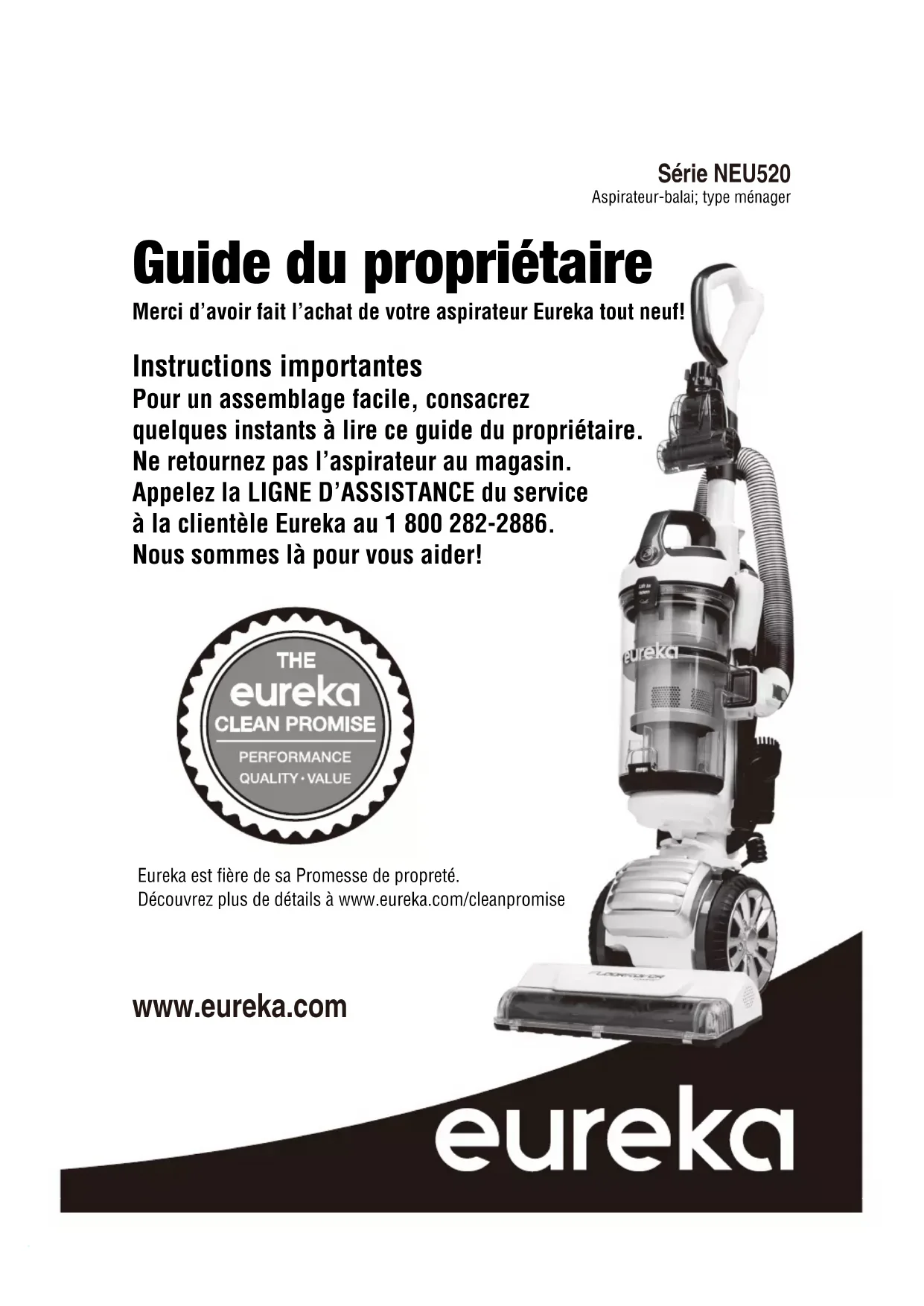 Pour un assemblage facile, consacre quelques instants à lire ce guide du propriétaire. Ne returnez pas l'aspirateur au magasin. Appelez la LIGNE D'ASSISTANCE du service à la clientèle Eureka au 1 800 282-2886. Nous sommes là pour vous aider!