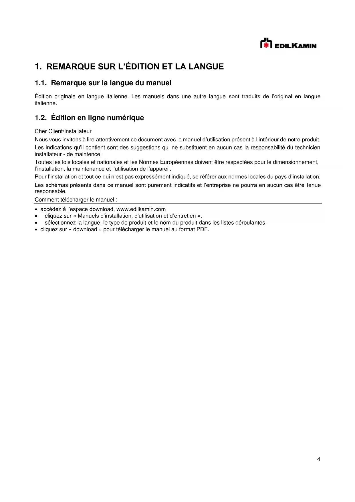 1.1. Remarque sur la langue du manuel Édition originale en langue italienne. Les manuels dans une autre langue sont traduits de l’original en langue italienne. 1.2. Édition en ligne numérique Cher Client/Installateur Nous vous invitons à lire attentivement ce document avec le manuel d’utilisation présent à l’intérieur de notre produit. Les indications qu'il contient sont des suggestions qui ne substituent en aucun cas la responsabilité du technicien installateur - de maintence. Toutes les lois locales et nationales et les Normes Européennes doivent être respectées pour le dimensionnement, l’installation, la maintenance et l’utilisation de l’appareil. Pour l’installation et tout ce qui n’est pas expressément indiqué, se référer aux normes locales du pays d’installation. Les schémas présents dans ce manuel sont purement indicatifs et l’entreprise ne pourra en aucun cas être tenue responsable. Comment télécharger le manuel : accédez à l’espace download, www.edilkamin.com cliquez sur « Manuels d’installation, d'utilisation et d’entretien ». sélectionnez la langue, le type de produit et le nom du produit dans les listes déroulantes. cliquez sur « download » pour télécharger le manuel au format PDF.5
