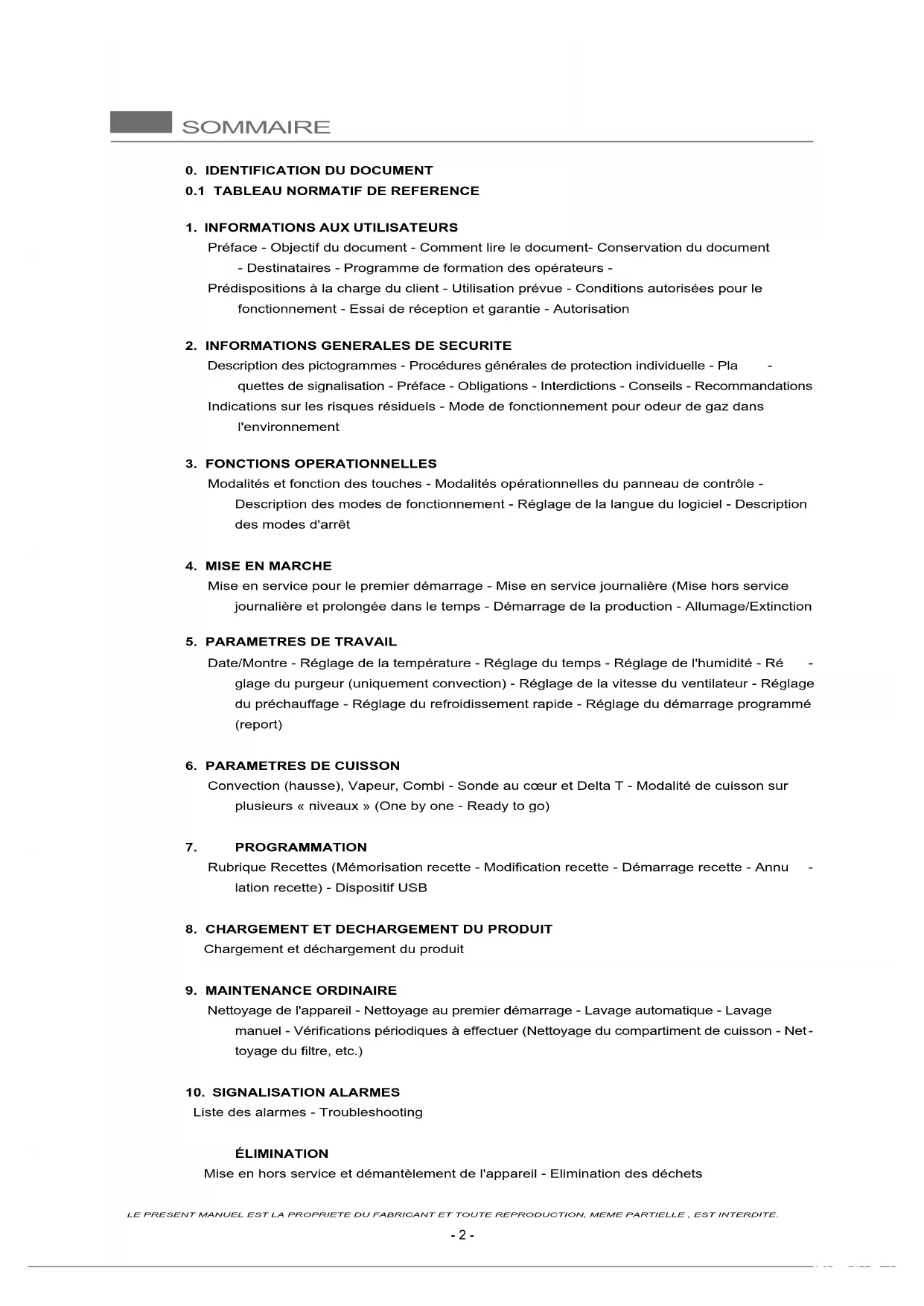 tionnementetlasécurité.Ilsdevrontdoncinteragirenutilisantlesmodesetlesinstrumentsappro- priés,enrespectantlesnormesdesécuritérequises. Lesinformationsreportéesdanscedocumentn'illustrentpasletransport,l'installationetlamaintenance extraordinairequidevrontêtreeffectuéesparlesopérateurstechniquesqualiésautyped'intervention à effectuer. L'opérateur«Hétérogène»destinatairedecettedocumentationdoitopérersurl'appareilaprèsquele technicienpréposéaitterminél'installation(transportxagedesraccordementsélectriques,hydriques, gazetd'évacuation). Cedocumentneconcernepaslesinformationssurchaquemodicationouvariationdecetappareil.Le fabricantseréserveledroitd'apporterdesmodicationssansenrendrecompte. Préface Obligations - Interdictions - Conseils - Recommandations7 LE PRESENT MANUEL EST LA PROPRIETE DU FABRICANT ET TOUTE REPRODUCTION, MEME PARTIELLE , EST INTERDITE.