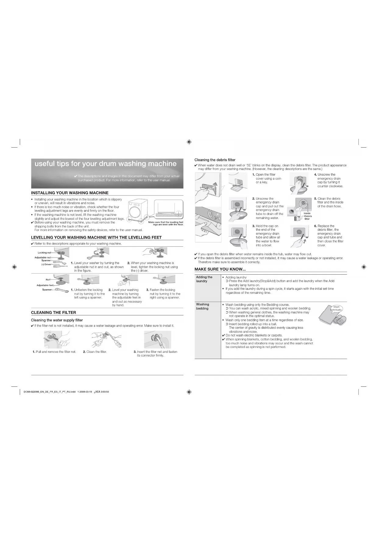 - Appuyez sur le bouton Démarrer/Pause et vérifiez le linge chargé. Répartissez le linge de manière égale et relancez le programme. AUTO-DIAGNOSTIC ✔ Si un message d’erreur autre que ceux présentés ci-dessous s’affiche, consultez le manuel d’utilisation. Affichage Symptôme Action Le hublot est ouvert Le hublot est-il ouvert ? ➲ Veillez à bien fermer le hublot avant de mettre le lave-linge en marche. L’arrivée d’eau ne fonctionne pas Le robinet est-il fermé ? ➲ Ouvrez le robinet. Le raccord du filtre du tuyau d’arrivée d’eau est-il bloqué ? ➲ Démontez et nettoyez le filtre du tuyau d’arrivée d’eau. L’eau ne s’évacue pas Le filtre de vidange est-il bouché ? ➲ Nettoyez le filtre de vidange. Le lave-linge est-il gelé à cause du froid ? ➲ Versez de l’eau chaude dans le tambour et laissez dégeler pendant environ une heure. La température interne du tambour est élevée Le cycle de séchage ou de lavage à l’air s’est-il interrompu ? Le lavage ne démarre pas automatiquement une fois le séchage terminé ? ➲ Le fonctionnement du ventilateur de refroidissement est automatique. Attendez donc que le message « Hot » disparaisse. ✔ Seuls les boutons Marche/Arrêt et Démarrer/Pause fonctionnent lors que le message « Hot » est affiché. ✔ Lorsque la température à l’intérieur du tambour est trop élevée, le hublot ne peut pas s’ouvrir. Si vous ouvrez le hublot de force, vous risquez d’endommager le lave-linge et de vous mettre en danger. Attendez donc que la température soit redescendue. L’eau ne s’évacue pas car sa température est supérieure à 55 °C, même si trente minutes se sont écoulées depuis la fin du cycle Avez-vous inversé l’arrivée d’eau chaude et l’arrivée d’eau froide ? ➲ Branchez correctement les tuyaux d’arrivée d’eau chaude et d’eau froide. ✔ Redémarrez le lave-linge en appuyant sur le bouton Démarrer/ Pause. Bouchon de rinçage MAX DC68-02209B_EN_DE_FR_ES_IT_PT_RU.indd 6 2008-03-19 ¿ÀÈÄ 3:03:56consejos útiles para la lavadora de tambor ✔ Las instrucciones y las ilustraciones de este documento puede diferir de las del producto que haya adquirido. Si desea obtener más información, consulte el manual del usuario.