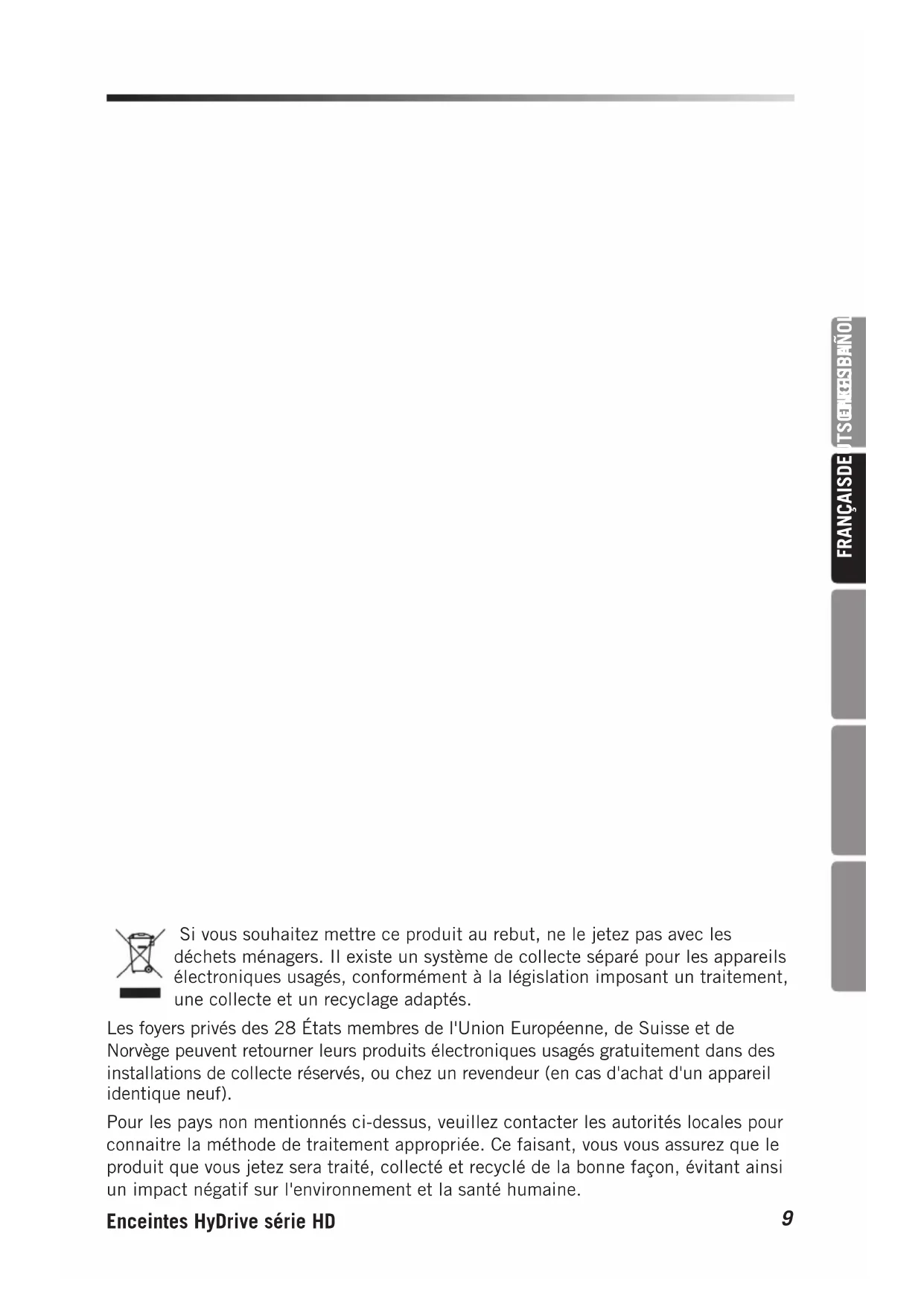Si vous souhaitez mettre ce produit au rebut, ne le jetez pas avec les déchets ménagers. Il existe un système de collecte séparé pour les appareils électroniques usagés, conformément à la législation imposant un traitement, une collecte et un recyclage adaptés. Les foyers privés des 28États membres de l'Union Européenne, de Suisse et de Norvège peuvent retourner leurs produits électroniques usagés gratuitement dans des installations de collecte réservés, ou chez un revendeur (en cas d'achat d'un appareil identique neuf). Pour les pays non mentionnés ci-dessus, veuillez contacter les autorités locales pour connaitre la méthode de traitement appropriée. Ce faisant, vous vous assurez que le produit que vous jetez sera traité, collecté et recyclé de la bonne façon, évitant ainsi un impact négatif sur l'environnement et la santé humaine.10 Merci d'avoir acheté un baffle de basses HyDrive HD de Hartke! Nous savons que vous n'aimez pas lire les manuels d'utilisation, mais vous venez d'acheter l'un des meilleurs systèmes de baffles de basses qui existe, et nous voulons vous en parler. Donc, avant de le brancher et de commencer à jouer, nous vous suggérons de prendre un moment pour parcourir ces quelques pages. La série HyDrive HD est la deuxième génération de baffles de basses dotés de transducteurs de graves à cônes hybrides brevetés. Les enceintes HyDrive sont dotées d'un cône extérieur en papier chargé de Kevlar
