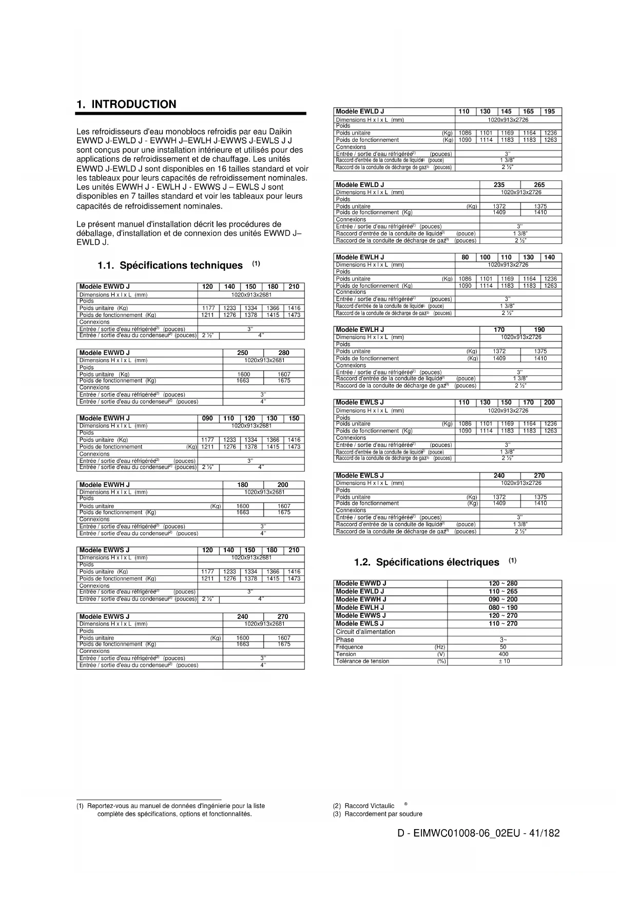 Les refroidisseurs d'eau monoblocs refroidis par eau Daikin EWWD J-EWLD J - EWWH J–EWLH J-EWWS J-EWLS J J sont conçus pour une installation intérieure et utilisés pour des applications de refroidissement et de chauffage. Les unités EWWD J-EWLD J sont disponibles en 16 tailles standard et voir les tableaux pour leurs capacités de refroidissement nominales. Les unités EWWH J - EWLH J - EWWS J – EWLS J sont disponibles en 7 tailles standard et voir les tableaux pour leurs capacités de refroidissement nominales. Le présent manuel d'installation décrit les procédures de déballage, d'installation et de connexion des unités EWWD J– EWLD J. 1.1. Spécifications techniques (1)