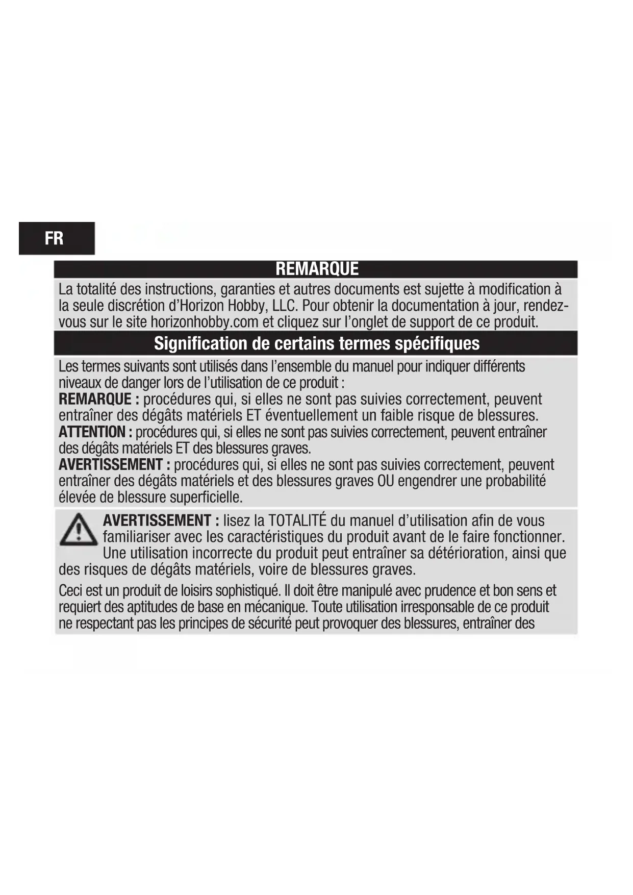 familiariser avec les caractéristiques du produit avant de le faire fonctionner. Une utilisation incorrecte du produit peut entraîner sa détérioration, ainsi que des risques de dégâts matériels, voire de blessures graves. Ceci est un produit de loisirs sophistiqué. Il doit être manipulé avec prudence et bon sens et requiert des aptitudes de base en mécanique. Toute utilisation irresponsable de ce produit ne respectant pas les principes de sécurité peut provoquer des blessures, entraîner des Les termes suivants sont utilisés dans l’ensemble du manuel pour indiquer différents niveaux de danger lors de l’utilisation de ce produit: REMARQUE: procédures qui, si elles ne sont pas suivies correctement, peuvent entraîner des dégâts matériels ET éventuellement un faible risque de blessures. ATTENTION: procédures qui, si elles ne sont pas suivies correctement, peuvent entraîner des dégâts matériels ET des blessures graves.
