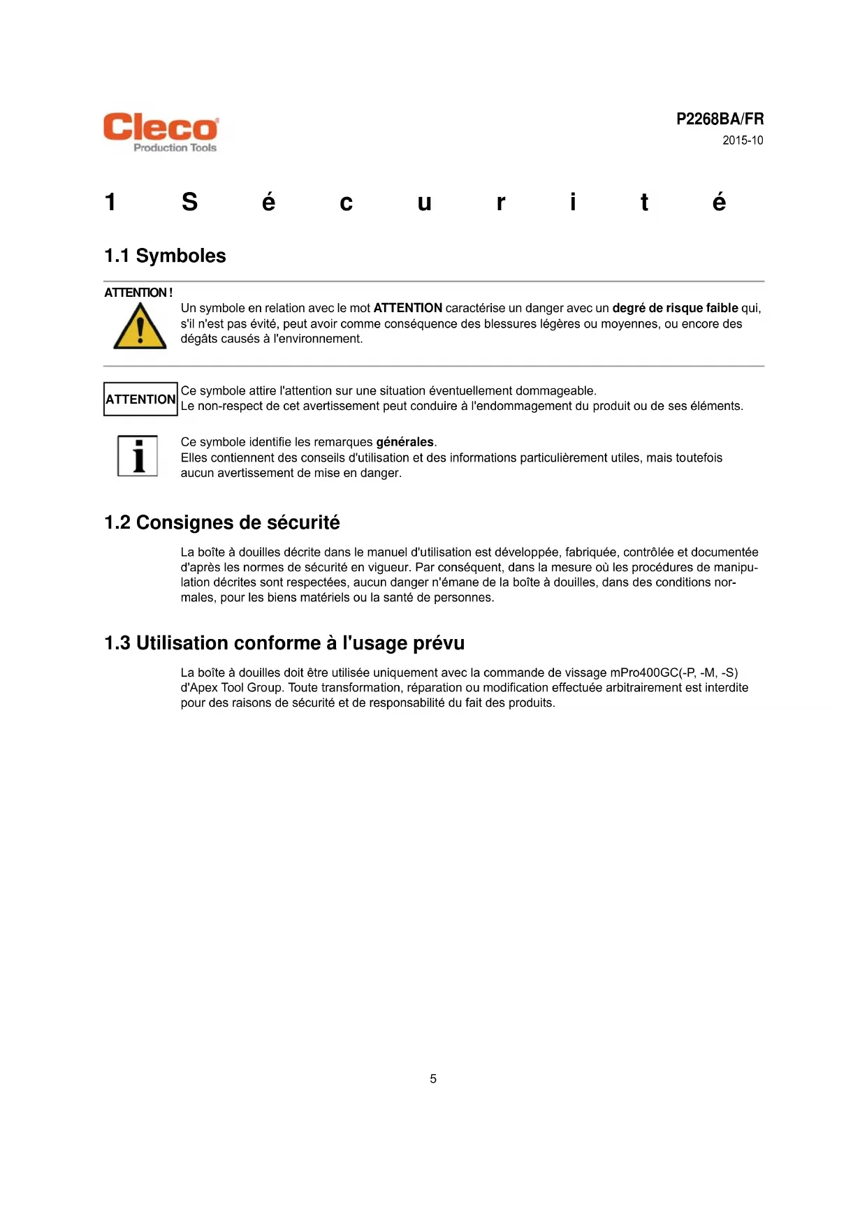 Vous trouverez de plus amples informations sur nos produits sur le site Internet http://www.ClecoTools.com Manuel d'utilisation P2268BA/FR 2015-10 S133410, S133411 Boîte à douilles Arcnet2 P2268BA/FR 2015-10 Remarque concernant ce manuel d'utilisation Le présent manuel constitue la notice d'instructions d'origine et