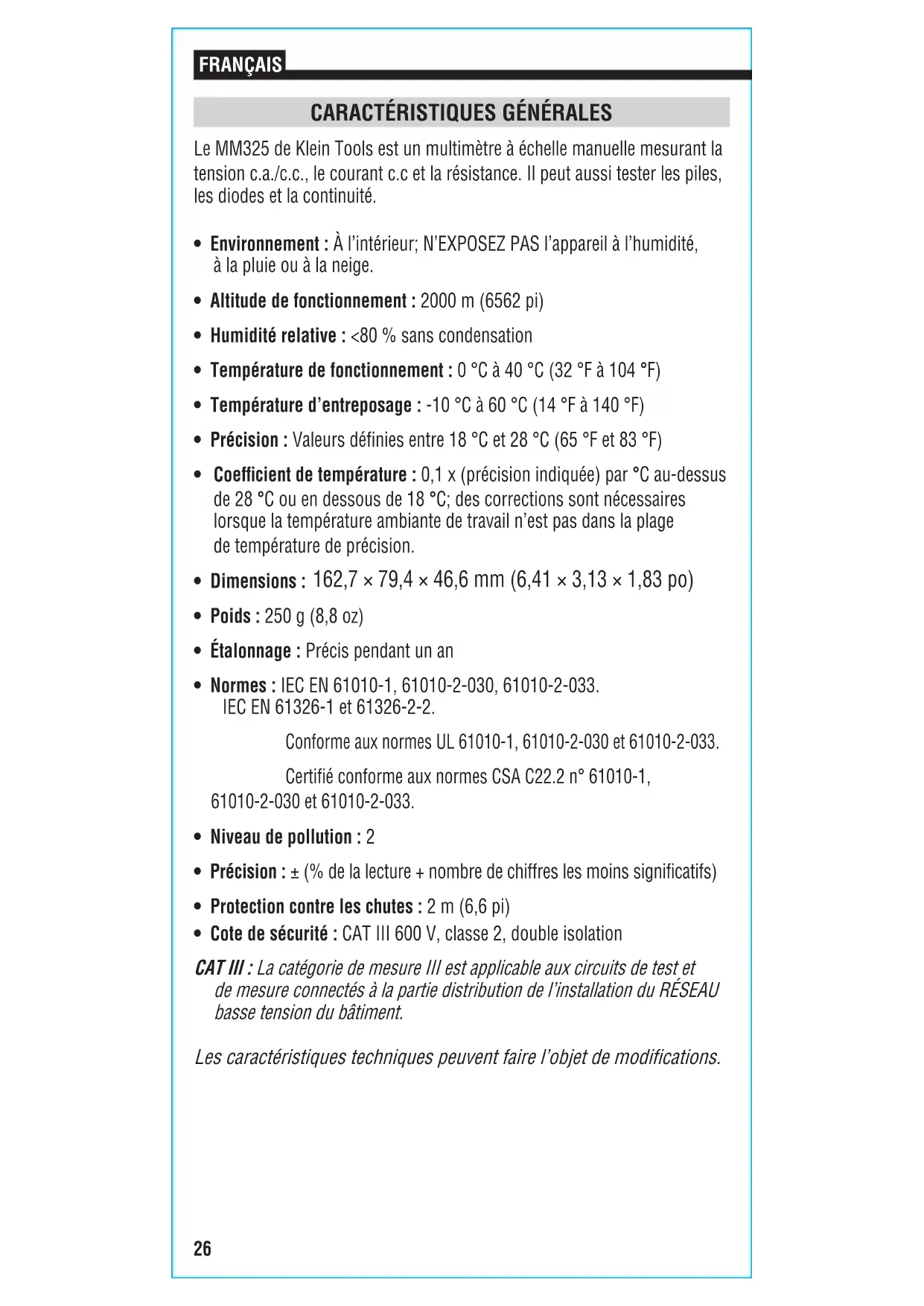 - Cote de sécurité: CATIII600V, classe2, double isolation CATIII: La catégorie de mesureIII est applicable aux circuits de test et de mesure connectés à la partie distribution de l’installation du RÉSEAU basse tension du bâtiment. Les caractéristiques techniques peuvent faire l’objet de modifications.27
