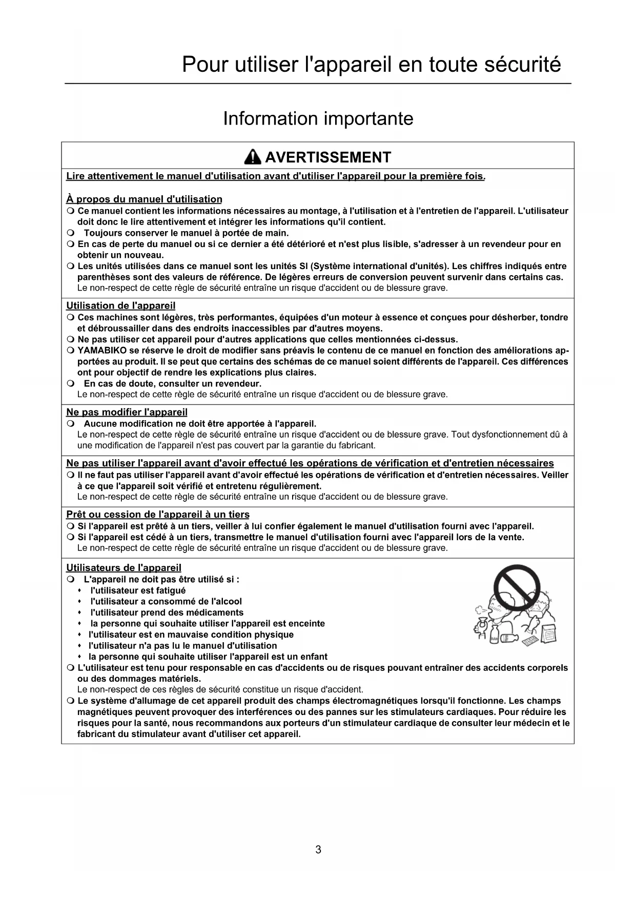 - Déclaration de conformité Pour utiliser l'appareil en toute sécurité Pour utili ser l'appareil en to ute sécurité Information importante AVERTISSEMENT Lire attentivement le manuel d'utilisation avant d'utiliser l'appareil pour la première fois. À propos du manuel d'utilisation Ce manuel contient les informations nécessaires au montage, à l'utilisation et à l'entretien de l'appareil. L'utilisateur doit donc le lire attentivement et intégrer les informations qu'il contient. Toujours conserver le manuel à portée de main. En cas de perte du manuel ou si ce dernier a été détérioré et n'est plus lisible, s'adresser à un revendeur pour en obtenir un nouveau. Les unités utilisées dans ce manuel sont les unités SI (Système international d'unités). Les chiffres indiqués entre parenthèses sont des valeurs de référence. De légères erreurs de conversion peuvent survenir dans certains cas.Le non-respect de cette règle de sécurité entraîne un risque d'accident ou de blessure grave. Utilisation de l'appareil Ces machines sont légères, très performantes, équipées d'un moteur à essence et conçues pour désherber, tondre et débroussailler dans des endroits inaccessibles par d'autres moyens. Ne pas utiliser cet appareil pour d'autres applications que celles mentionnées ci-dessus. YAMABIKO se réserve le droit de modifier sans préavis le contenu de ce manuel en fonction des améliorations ap- portées au produit. Il se peut que certains des schémas de ce manuel soient différents de l'appareil. Ces différences ont pour objectif de rendre les explications plus claires. En cas de doute, consulter un revendeur.Le non-respect de cette règle de sécurité entraîne un risque d'accident ou de blessure grave. Ne pas modifier l'appareil Aucune modification ne doit être apportée à l'appareil. Le non-respect de cette règle de sécurité entraîne un risque d'accident ou de blessure grave. Tout dysfonctionnement dû à une modification de l'appareil n'est pas couvert par la garantie du fabricant. Ne pas utiliser l'appareil avant d'avoir effectué les opérations de vérification et d'entretien nécessaires Il ne faut pas utiliser l'appareil avant d'avoir effectué les opérations de vérification et d'entretien nécessaires. Veiller à ce que l'appareil soit vérifié et entretenu régulièrement.Le non-respect de cette règle de sécurité entraîne un risque d'accident ou de blessure grave. Prêt ou cession de l'appareil à un tiers Si l'appareil est prêté à un tiers, veiller à lui confier également le manuel d'utilisation fourni avec l'appareil. Si l'appareil est cédé à un tiers, transmettre le manuel d'utilisation fourni avec l'appareil lors de la vente. Le non-respect de cette règle de sécurité entraîne un risque d'accident ou de blessure grave. Utilisateurs de l'appareil L'appareil ne doit pas être utilisé si : l'utilisateur est fatigué l'utilisateur a consommé de l'alcool l'utilisateur prend des médicaments la personne qui souhaite utiliser l'appareil est enceinte l'utilisateur est en mauvaise condition physique l'utilisateur n'a pas lu le manuel d'utilisation la personne qui souhaite utiliser l'appareil est un enfant L'utilisateur est tenu pour responsable en cas d'accidents ou de risques pouvant entraîner des accidents corporels ou des dommages matériels.Le non-respect de ces règles de sécurité constitue un risque d'accident. Le système d'allumage de cet appareil produit des champs électromagnétiques lorsqu'il fonctionne. Les champs magnétiques peuvent provoquer des interférences ou des pannes sur les stimulateurs cardiaques. Pour réduire les risques pour la santé, nous recommandons aux porteurs d'un stimulateur cardiaque de consulter leur médecin et le fabricant du stimulateur avant d'utiliser cet appareil.4 Pour utiliser l'appareil en toute sécurité Exposition aux vibrations et au froid Les personnes exposées aux vibrations et au froid peuvent être victimes du phénomène de Raynaud, une affection qui touche les doigts. L'exposition à des vibrations et au froid peut provoquer une sensation de picotement et de brûlure, suivie d'une décoloration et d'un engourdissement des doigts. Il est vivement recommandé de respecter les mesures de précaution suivantes car le seuil d'exposition minimum pouvant provoquer l'apparition de ce phéno- mène reste inconnu à ce jour. Limiter la perte de chaleur corporelle, en protégeant en priorité la tête, le cou, les pieds, les chevilles, les mains et les poignets. Stimuler la circulation sanguine en interrompant le travail régulièrement pour remuer énergiquement les bras, et éviter de fumer. Limiter le nombre d'heures d'utilisation. Essayer d'intégrer à l'emploi du temps de la journée des tâches ne né- cessitant pas l'utilisation de l'appareil ou d'une autre machine portative. En cas d'inconfort, de rougeur et de gonflement au niveau des doigts, suivis d'un blanchissement et d'une perte de sensibilité, consulter un médecin avant de s'exposer à nouveau au froid et aux vibrations. Le non-respect de ces instructions peut être dangereux pour la santé. Lésions attribuables au travail répétitif Il apparaît que la sollicitation excessive des muscles et des tendons des doigts, des mains, des bras et des épaules peut provoquer une irritation, un gonflement, un engourdissement, une faiblesse et de fortes douleurs au niveau des membres mentionnés ci-dessus. L'apparition de lésions attribuables au travail répétitif (LATR) est très fréquente chez les personnes pratiquant certaines activités manuelles répétitives. Pour réduire le risque d'apparition de LATR, respecter les mesures de précaution suivantes : Éviter de plier, d'étirer ou de tordre le poignet pendant le travail. Faire des pauses régulières pour réduire l'effet répétitif et pour reposer ses mains. Effectuer le mouvement répé- titif plus lentement et en faisant moins d'effort. Faire des exercices d