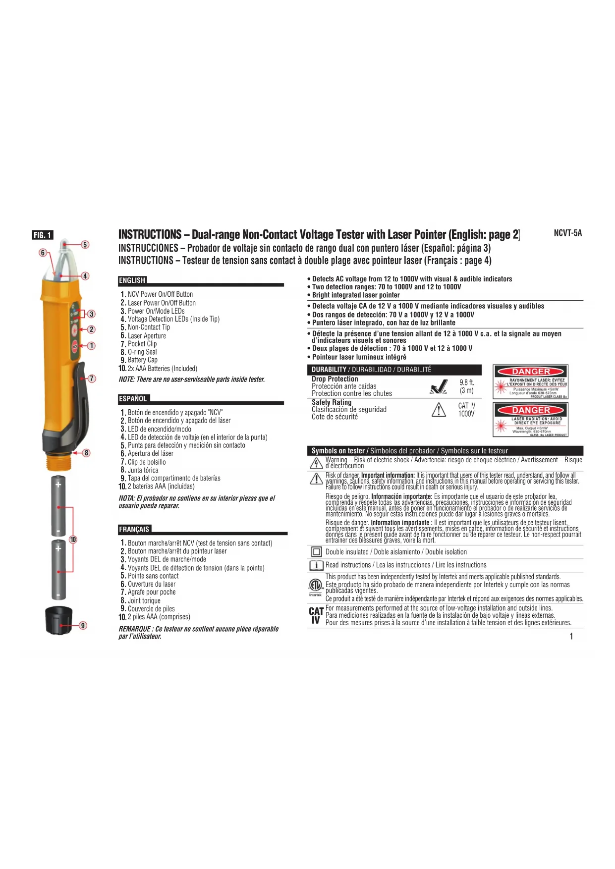 Bouton marche/arrêt NCV (test de tension sans contact) Bouton marche/arrêt du pointeur laser VoyantsDEL de marche/mode VoyantsDEL de détection de tension (dans la pointe) Pointe sans contact Ouverture du laser Agrafe pour poche Joint torique Couvercle de piles 2pilesAAA (comprises) REMARQUE: Ce testeur ne contient aucune pièce réparable par l’utilisateur.
