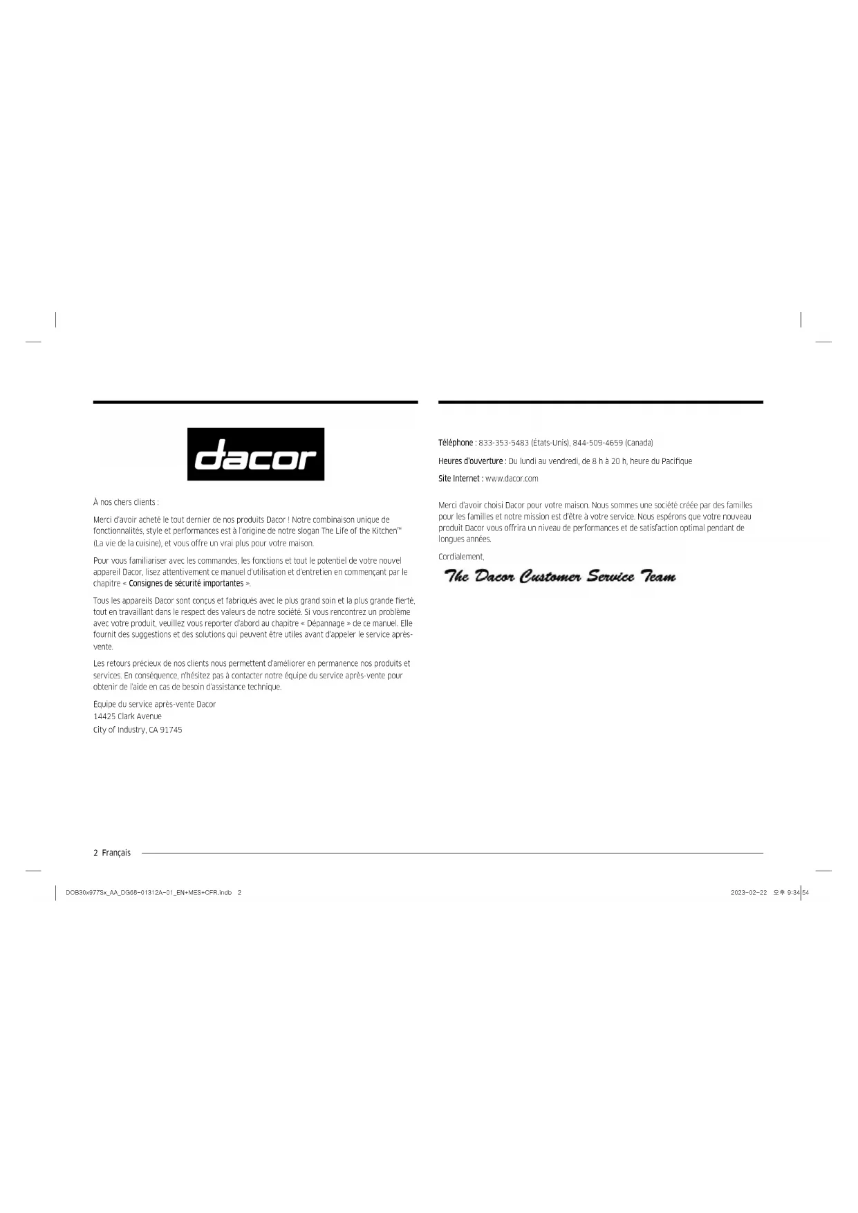 Le terme « IC » placé avant le numéro de certication pour les radiofréquences signie seulement que les spécications techniques d'Industry Canada ont été respectées. Son fonctionnement est soumis aux deux conditions suivantes : (1) cet appareil ne doit pas provoquer d'interférences, et (2) cet appareil doit accepter toute interférence, y compris les interférences susceptibles d'entraîner un fonctionnement indésirable de l'appareil. DOB30x977Sx_AA_DG68-01312A-01_EN+MES+CFR.indb 57DOB30x977Sx_AA_DG68-01312A-01_EN+MES+CFR.indb 57 2023-02-22 오후 9:35:132023-02-22 오후 9:35:1358 Français Annonce de contenu libre Annonce de contenu libre Le present produit contient un logiciel libre. Vous pouvez obtenir l’intégralité du code source correspondant durant une période de trois ans après la dernière livraison de ce produit en contactant notre équipe d'assistance via http://opensource.samsung.com (Veuillez utiliser le menu « Inquiry ».) Il est également possible d’obtenir l’intégralité du code source correspondant sur un support physique tel qu’un CD-ROM. Des frais minimum seront requis. L'URL suivante http://opensource.samsung.com/opensource/OVEN_A20_TZ/seq/0 donne accès aux informations de licence gratuites associées à cet appareil. Cette offre est valable pour toute personne accusant réception de ces informations. Notes DOB30x977Sx_AA_DG68-01312A-01_EN+MES+CFR.indb 58DOB30x977Sx_AA_DG68-01312A-01_EN+MES+CFR.indb 58 2023-02-22 오후 9:35:132023-02-22 오후 9:35:13Français 59 Notes DOB30x977Sx_AA_DG68-01312A-01_EN+MES+CFR.indb 59DOB30x977Sx_AA_DG68-01312A-01_EN+MES+CFR.indb 59 2023-02-22 오후 9:35:132023-02-22 오후 9:35:13Dacor ∙ 14425 Clark Avenue, City of Industry, CA 91745 ∙ Téléphone : 833-353-5483 (États-Unis), 844-509-4659 (Canada) ∙ www.dacor.com DG68-01312A-01 DOB30x977Sx_AA_DG68-01312A-01_EN+MES+CFR.indb 60DOB30x977Sx_AA_DG68-01312A-01_EN+MES+CFR.indb 60 2023-02-22 오후 9:35:132023-02-22 오후 9:35:13
