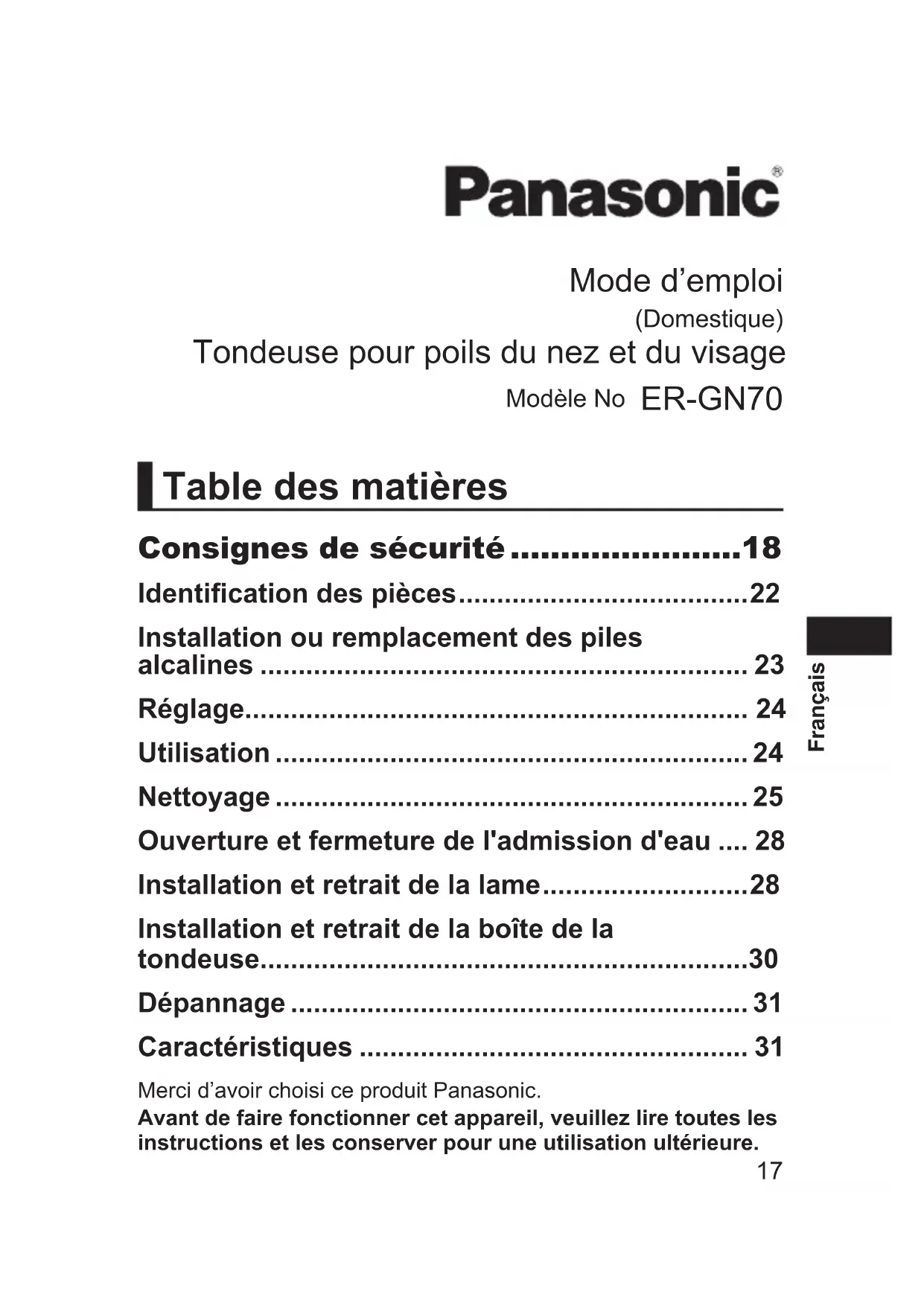 - 30-Day Quality Satisfaction Guarantee If you are dissatised with any Panasonic Personal Care & Beauty Care Products for any reason, simply return it to the place of purchase with a dated proof of purchase, in the original packaging, with all accessories, parts and instructions, within 30 days of the date of purchase, for a full refund, or call Panasonic at 1-800-338-0552. Abuse or misapplication of this product voids the guarantee. PB016722 - ER-GN70_(01GB)_07-30-18.indd 16 2018/7/30 16:29:4417 Français Merci d’avoir choisi ce produit Panasonic.Avant de faire fonctionner cet appareil, veuillez lire toutes les instructions et les conserver pour une utilisation ultérieure. Mode d’emploi (Domestique) Tondeuse pour poils du nez et du visage Modèle No ER-GN70 Table des matières Consignes de sécurité p. 18