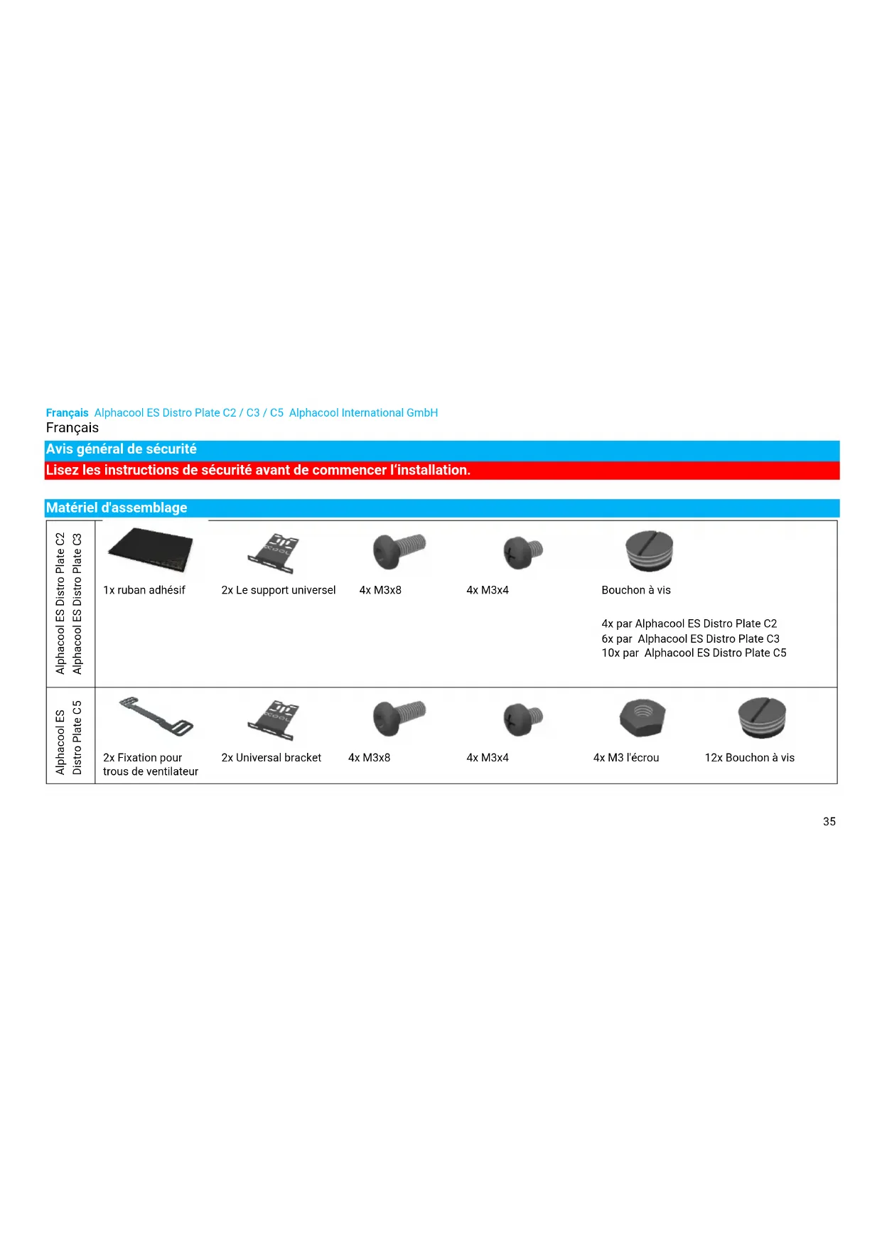 Français Avis général de sécurité Lisez les instructions de sécurité avant de commencer l‘installation. Matériel d'assemblage Alphacool ES Distro Plate C2 Alphacool ES Distro Plate C