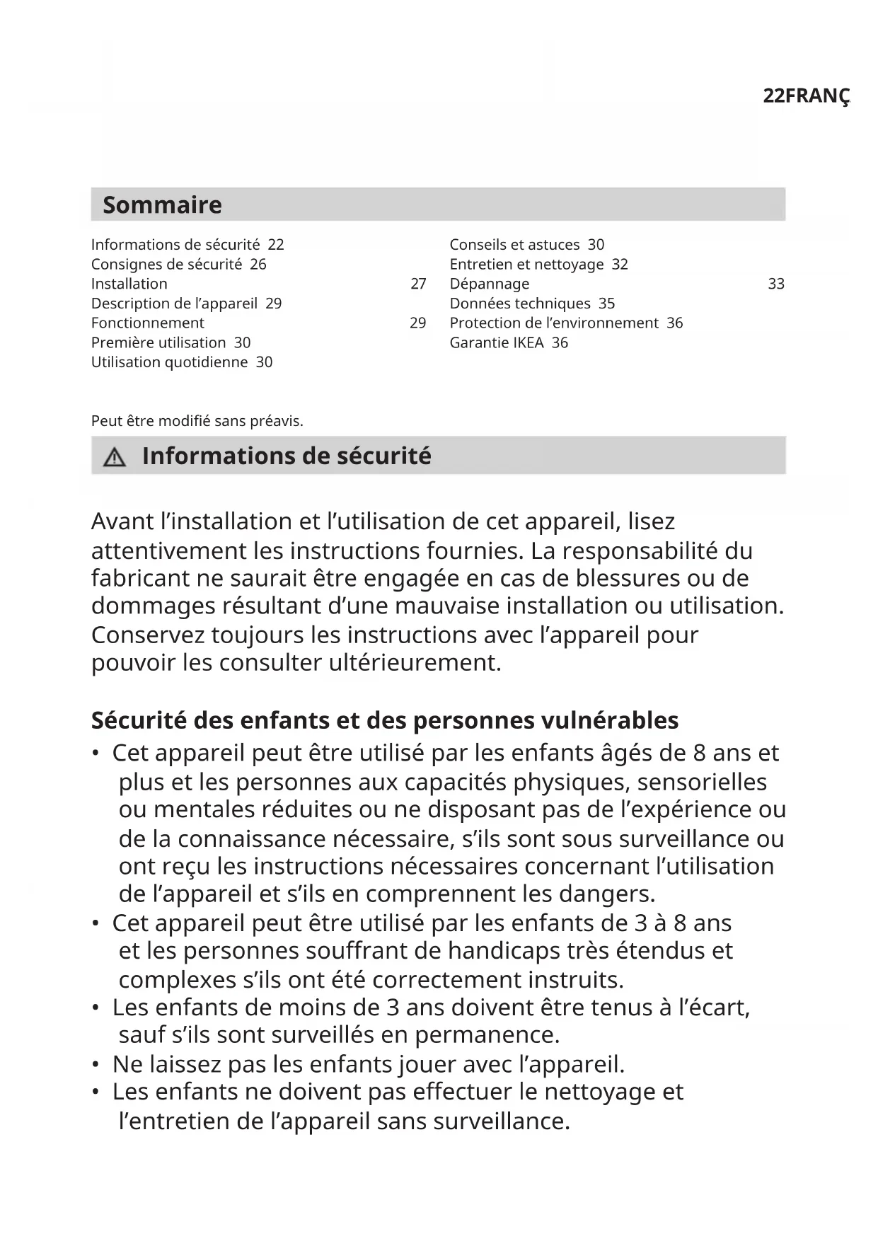 - Les frais liés à l’installation initiale de l’appareil IKEA. Toutefois, si un prestataire de services IKEA ou son partenaire de service agréé répare ou remplace l’appareil selon les termes de cette garantie, le prestataire de services ou son partenaire de service agréé réinstallera l’appareil réparé ou installera l’appareil de rechange, si nécessaire. Cette restriction ne s’applique pas aux travaux sans défaut eectués par un spécialiste qualié utilisant nos pièces d’origine an d’adapter l’appareil aux spécications techniques de sécurité d’un autre pays de l’UE. Loi nationale applicable La garantie IKEA vous donne des droits légaux spéciques, qui couvrent ou dépassent les exigences locales. Cependant, ces conditions ne limitent en aucun cas les droits des consommateurs décrits dans la législation locale. Zone de validité Pour les appareils achetés dans un pays européen et transportés dans un autre pays européen, les interventions seront eectuées dans le cadre des conditions de garantie normales dans le nouveau pays. L’obligation de réparation dans le cadre de la garantie n’est eective que si l’appareil est conforme et installé conformément aux: