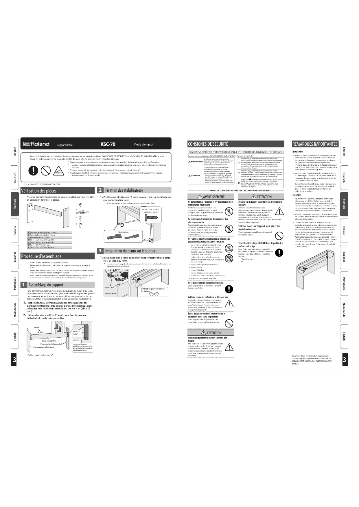 AVERTISSEMENT Ne démontez pas l’appareil et n’y apportez aucune modication vous-mêmeN’eectuez aucune opération sauf instruction spécique dans le mode d’emploi. Vous risquez sinon de provoquer un dysfonctionnement.Ne tentez pas de réparer ou de remplacer des pièces vous-mêmePour toute intervention de maintenance, contactez votre revendeur, le centre de service Roland le plus proche ou un distributeur Roland agréé (voir « Informations »).Ne l’utilisez pas et ne le stockez pas dans un lieu présentant les caractéristiques suivantes• exposé à des températures extrêmes (à la lumière directe du soleil dans un véhicule fermé, près d’un conduit chaué ou sur un dispositif générateur de chaleur, par exemple);• embué (dans une salle de bains, un cabinet de toilette ou sur un sol mouillé, par exemple);• exposé à la vapeur ou à la fumée;• exposé au sel;• exposé à la pluie;• exposé à la poussière ou au sable;• soumis à de fortes vibrations ou secousses;• placé dans un endroit mal aéré.Ne le placez pas sur une surface instableVous risquez de vous blesser si l’appareil bascule ou chute.Veillez à ce que les enfants ne se blessent pasLes adultes doivent toujours exercer une surveillance et un accompagnement en cas d’utilisation de l’appareil dans des endroits où des enfants sont présents ou manipulent l’appareil.Évitez de laisser tomber l’appareil ou de le soumettre à des chocs importantsVous risquez sinon de provoquer des dommages ou un dysfonctionnement. ATTENTION Utilisez uniquement le support fabriqué par RolandThis stand for use only with specic Roland musical instruments. Reportez-vous aux instructions de l’appareil. L’utilisation avec d’autres modèles peut entraîner une instabilité susceptible de provoquer des blessures. ATTENTION Évaluez les risques de sécurité avant d’utiliser des supportsMême si vous tenez compte des avertissements mentionnés dans le Mode d’emploi, il peut arriver que le produit tombe du support ou que le support bascule suite à certaines manipulations. Prenez en considération tous les risques de sécurité avant d’utiliser ce produit.Évitez de monter sur l’appareil ou de placer des objets lourds dessusVous risquez de vous blesser si l’appareil bascule ou chute.Tenez les pièces de petite taille hors de portée des enfants en bas âgePour éviter tout ingestion accidentelle des pièces indiquées ci-dessous, tenez-les toujours hors de portée des enfants en bas âge.• Pièces fournies Vis REMARQUES IMPORTANTES Installation• Veillez à ce que des dispositifs d’éclairage qui sont normalement utilisés avec leur source lumineuse très proche de l’appareil (par exemple une lampe de piano) ou des spots lumineux puissants n’éclairent pas la même zone de l’appareil pendant une période prolongée. Une chaleur excessive peut déformer ou décolorer l’appareil.• Ne collez pas d’autocollants, de décalcomanies ou d’autres objets similaires sur cet instrument. Vous risqueriez d’endommager la nition extérieure de l’instrument en les décollant.• Suivant le matériau et la température de la surface sur laquelle vous placez l’appareil, il est possible que ses pieds en caoutchouc décolorent ou détériorent la surface. Entretien• Pour nettoyer l’appareil, utilisez un chion sec et doux, ou un chion légèrement humidié. Essayez de nettoyer toute la surface en utilisant une pression égale, en déplaçant le chion le long du grain du bois. Vous risquez d’endommager la nition si vous frottez trop fort la même zone.• N’utilisez jamais de benzine, de diluant, d’alcool ou de solvants an d’éviter tout risque de décoloration et/ou de déformation.• Comme pour tout produit en bois, il peut se produire une certaine expansion et contraction du bois selon la manière dont l’appareil est utilisé et son environnement d’utilisation. Au l du temps, il peut arriver que certaines vis commencent à se desserrer. Pour garantir un fonctionnement able et sans souci de l’appareil, pensez à vérier régulièrement que les vis sont bien serrées comme montré sur l’illustration. Si vous constatez que certaines vis sont desserrées, resserrez-les à l’aide d’un tournevis.Copyright © 2015 ROLAND CORPORATION Avant d’utiliser le support, veuillez lire attentivement les sections intitulées « CONSIGNES DE SÉCURITÉ » et « REMARQUES IMPORTANTES ». Vous devez en outre conserver ce manuel à portée de main an de pouvoir vous y reporter si besoin.* Assurez-vous qu’une autre personne est présente pour vous aider lors de l’assemblage et de la conguration.