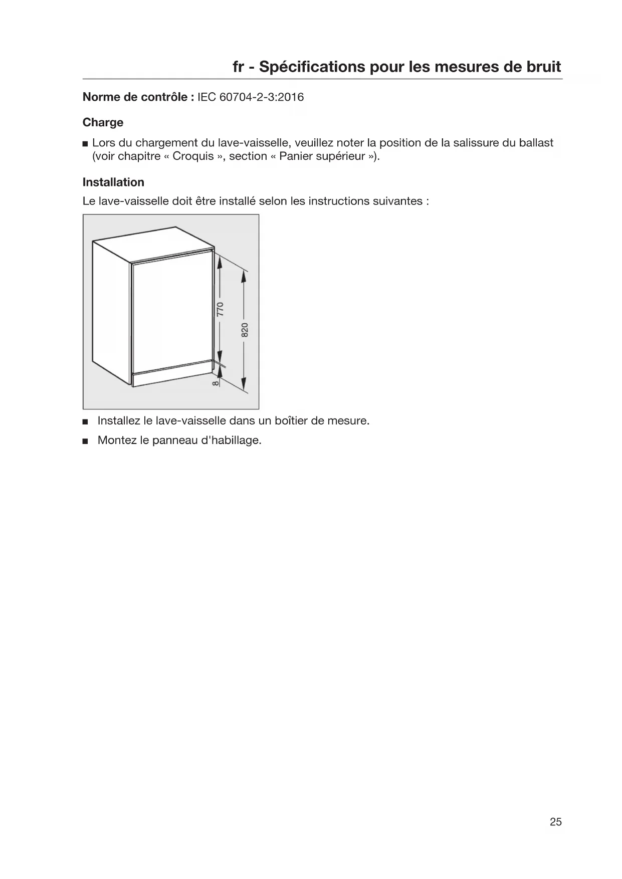 Norme de contrôle : IEC 60704-2-3:2016 Charge Lors du chargement du lave-vaisselle, veuillez noter la position de la salissure du ballast (voir chapitre « Croquis », section « Panier supérieur »). Installation Le lave-vaisselle doit être installé selon les instructions suivantes : Installez le lave-vaisselle dans un boîtier de mesure. Montez le panneau d'habillage.fr - Spécifications pour les mesures de bruit