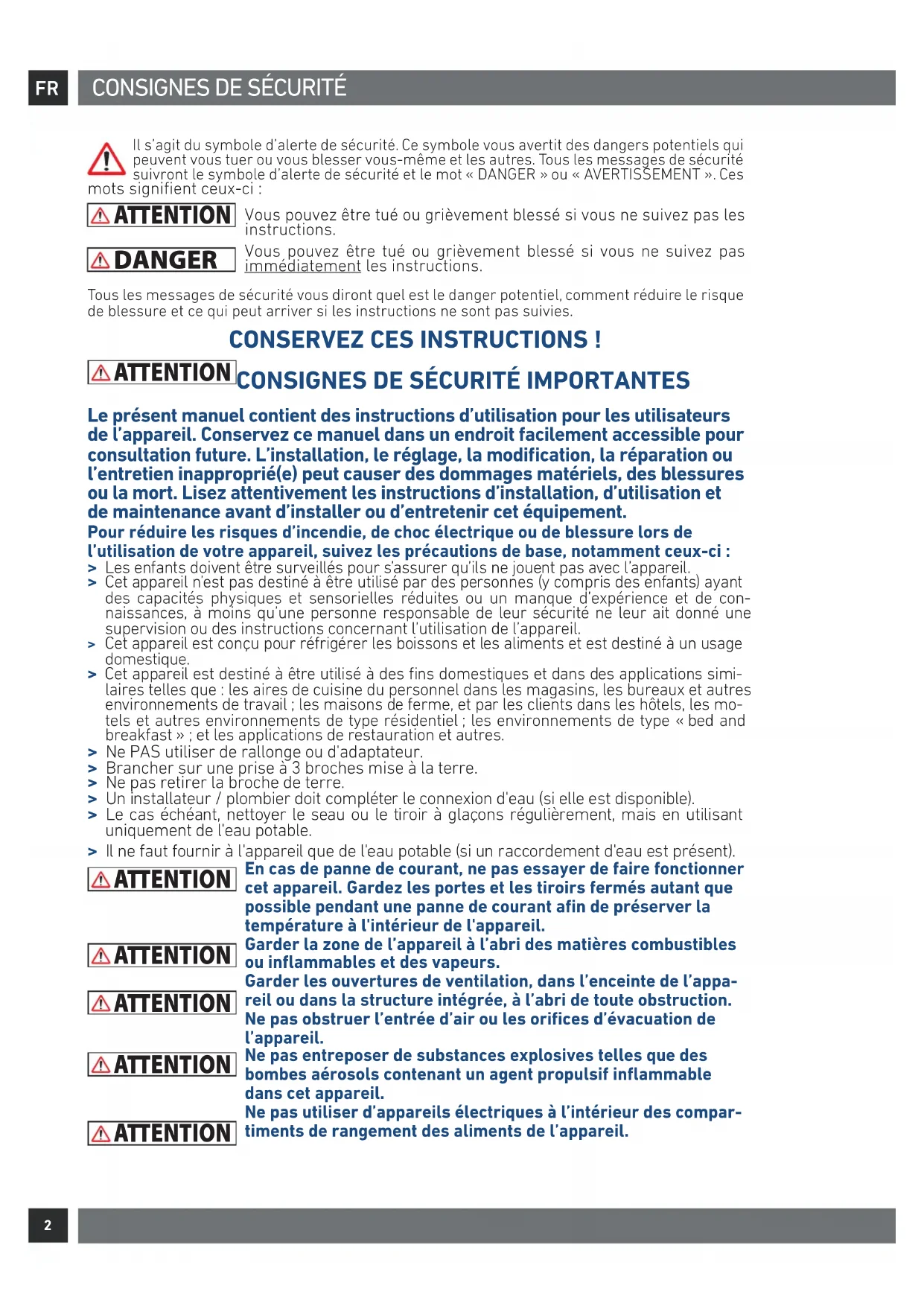 Le présent manuel contient des instructions d’utilisation pour les utilisateurs de l’appareil. Conservez ce manuel dans un endroit facilement accessible pour consultation future. L’installation, le réglage, la modification, la réparation ou l’entretien inapproprié(e) peut causer des dommages matériels, des blessures ou la mort. Lisez attentivement les instructions d’installation, d’utilisation et de maintenance avant d’installer ou d’entretenir cet équipement. Pour réduire les risques d’incendie, de choc électrique ou de blessure lors de l’utilisation de votre appareil, suivez les précautions de base, notamment ceux-ci: > Les enfants doivent être surveillés pour s’assurer qu’ils ne jouent pas avec l’appareil. > Cet appareil n’est pas destiné à être utilisé par des personnes (y compris des enfants) ayant des capacités physiques et sensorielles réduites ou un manque d’expérience et de con-naissances, à moins qu’une personne responsable de leur sécurité ne leur ait donné une supervision ou des instructions concernant l’utilisation de l’appareil. > Cet appareil est conçu pour réfrigérer les boissons et les aliments et est destiné à un usage domestique. > Cet appareil est destiné à être utilisé à des fins domestiques et dans des applications simi- laires telles que: les aires de cuisine du personnel dans les magasins, les bureaux et autres environnements de travail; les maisons de ferme, et par les clients dans les hôtels, les mo- tels et autres environnements de type résidentiel; les environnements de type «bed and breakfast»; et les applications de restauration et autres.> Ne PAS utiliser de rallonge ou d'adaptateur.> Brancher sur une prise à 3 broches mise à la terre.> Ne pas retirer la broche de terre. > Un installateur / plombier doit compléter le connexion d'eau (si elle est disponible). > Le cas échéant, nettoyer le seau ou le tiroir à glaçons régulièrement, mais en utilisant uniquement de l'eau potable. > Il ne faut fournir à l'appareil que de l'eau potable (si un raccordement d'eau est présent). ATTENTION