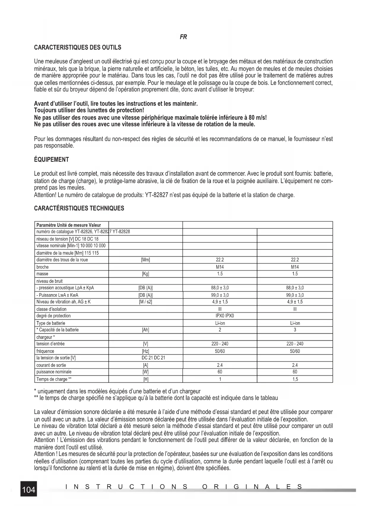 - uniquement dans les modèles équipés d’une batterie et d’un chargeur ** le temps de charge spécifi é ne s’applique qu’à la batterie dont la capacité est indiquée dans le tableau La valeur d’émission sonore déclarée a été mesurée à l’aide d’une méthode d’essai standard et peut être utilisée pour comparer un outil avec un autre. La valeur d’émission sonore déclarée peut être utilisée dans l’évaluation initiale de l’exposition. Le niveau de vibration total déclaré a été mesuré selon la méthode d’essai standard et peut être utilisé pour comparer un outil avec un autre. Le niveau de vibration total déclaré peut être utilisé pour l’évaluation initiale de l’exposition. Attention ! L’émission des vibrations pendant le fonctionnement de l’outil peut diff érer de la valeur déclarée, en fonction de la manière dont l’outil est utilisé. Attention ! Les mesures de sécurité pour la protection de l’opérateur, basées sur une évaluation de l’exposition dans les conditions réelles d’utilisation (comprenant toutes les parties du cycle d’utilisation, comme la durée pendant laquelle l’outil est à l’arrêt ou lorsqu’il fonctionne au ralenti et la durée de mise en régime), doivent être spécifi ées.105 INSTRUCTIONS ORIGINALES