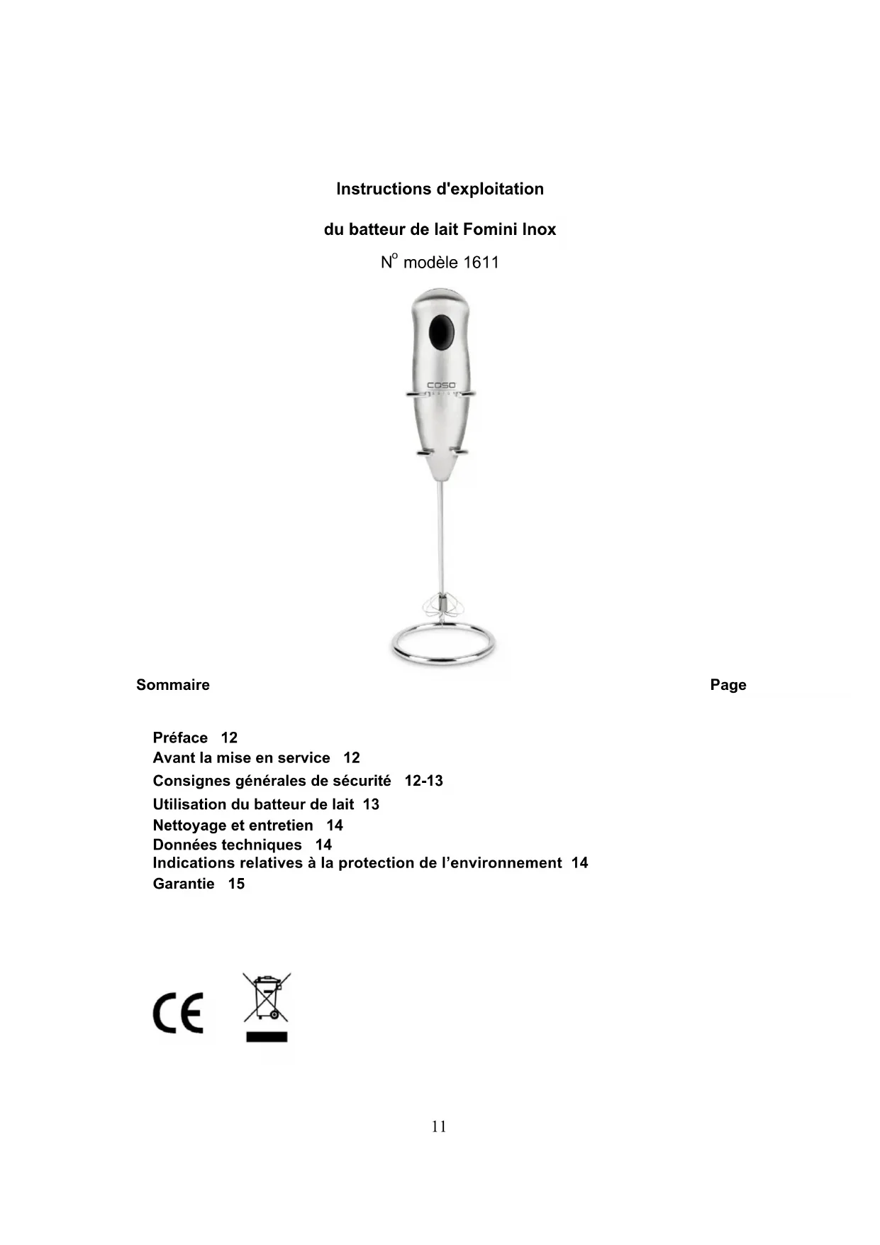 Sommaire Page Préface 12 Avant la mise en service 12 Consignes générales de sécurité 12-13 Utilisation du batteur de lait 13 Nettoyage et entretien 14 Données techniques 14 Indications relatives à la protection de l’environnement 14 Garantie 1512