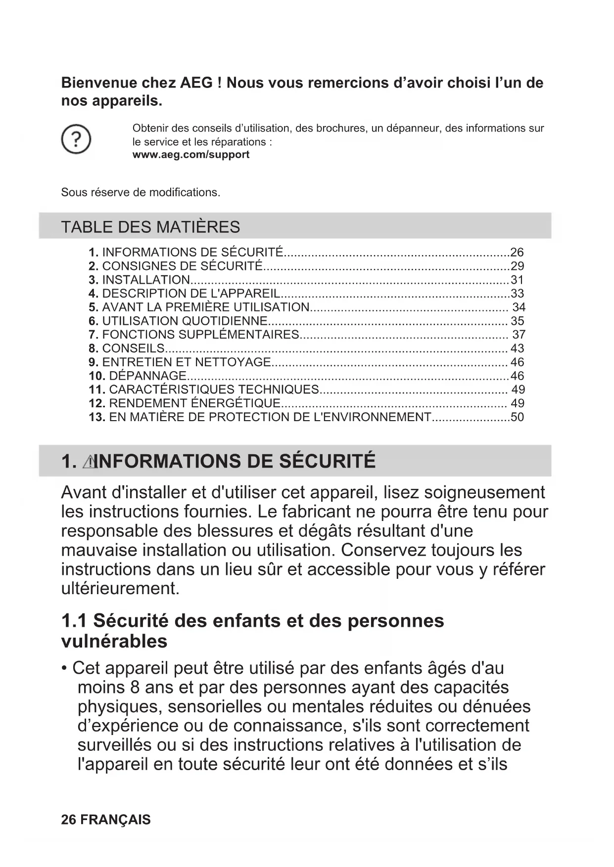 - Cet appareil peut être utilisé par des enfants âgés d'au moins 8 ans et par des personnes ayant des capacités physiques, sensorielles ou mentales réduites ou dénuées d’expérience ou de connaissance, s'ils sont correctement surveillés ou si des instructions relatives à l'utilisation de l'appareil en toute sécurité leur ont été données et s’ils 26 FRANÇAIScomprennent les risques encourus. Les enfants de moins de 8 ans et les personnes ayant un handicap très important et complexe doivent être tenus à l'écart de l’appareil, à moins d'être surveillés en permanence.