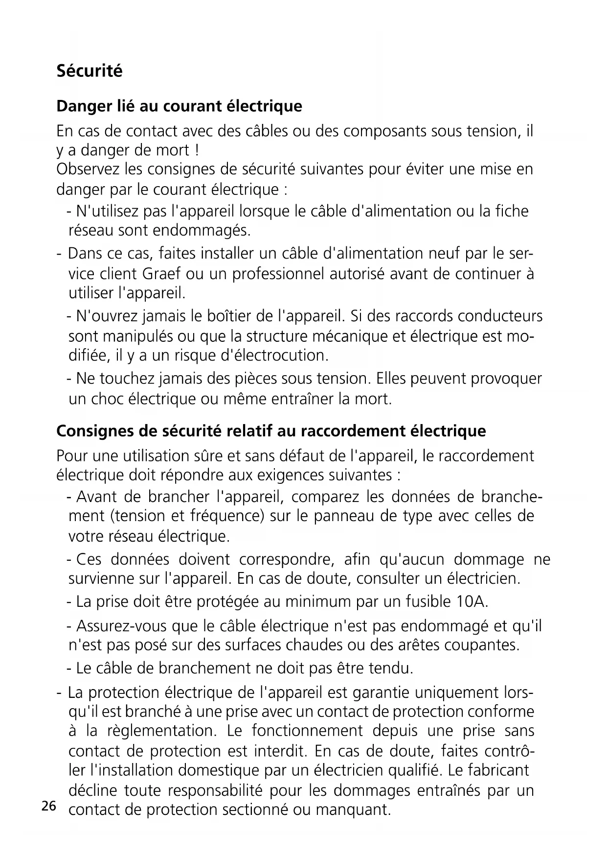 - Garantie Sécurité Danger lié au courant électrique En cas de contact avec des câbles ou des composants sous tension, il y a danger de mort! Observez les consignes de sécurité suivantes pour éviter une mise en danger par le courant électrique: - N'utilisez pas l'appareil lorsque le câble d'alimentation ou la che réseau sont endommagés. - Dans ce cas, faites installer un câble d'alimentation neuf par le ser- vice client Graef ou un professionnel autorisé avant de continuer à utiliser l'appareil. - N'ouvrez jamais le boîtier de l'appareil. Si des raccords conducteurs sont manipulés ou que la structure mécanique et électrique est mo- diée, il y a un risque d'électrocution. - Ne touchez jamais des pièces sous tension. Elles peuvent provoquer un choc électrique ou même entraîner la mort. Consignes de sécurité relatif au raccordement électrique Pour une utilisation sûre et sans défaut de l'appareil, le raccordement électrique doit répondre aux exigences suivantes: - Avant de brancher l'appareil, comparez les données de branche- ment (tension et fréquence) sur le panneau de type avec celles de votre réseau électrique. - Ces données doivent correspondre, an qu'aucun dommage ne survienne sur l'appareil. En cas de doute, consulter un électricien. - La prise doit être protégée au minimum par un fusible 10A. - Assurez-vous que le câble électrique n'est pas endommagé et qu'il n'est pas posé sur des surfaces chaudes ou des arêtes coupantes. - Le câble de branchement ne doit pas être tendu. - La protection électrique de l'appareil est garantie uniquement lors- qu'il est branché à une prise avec un contact de protection conforme à la règlementation. Le fonctionnement depuis une prise sans contact de protection est interdit. En cas de doute, faites contrô- ler l'installation domestique par un électricien qualié. Le fabricant décline toute responsabilité pour les dommages entraînés par un contact de protection sectionné ou manquant.27 p. 3526
