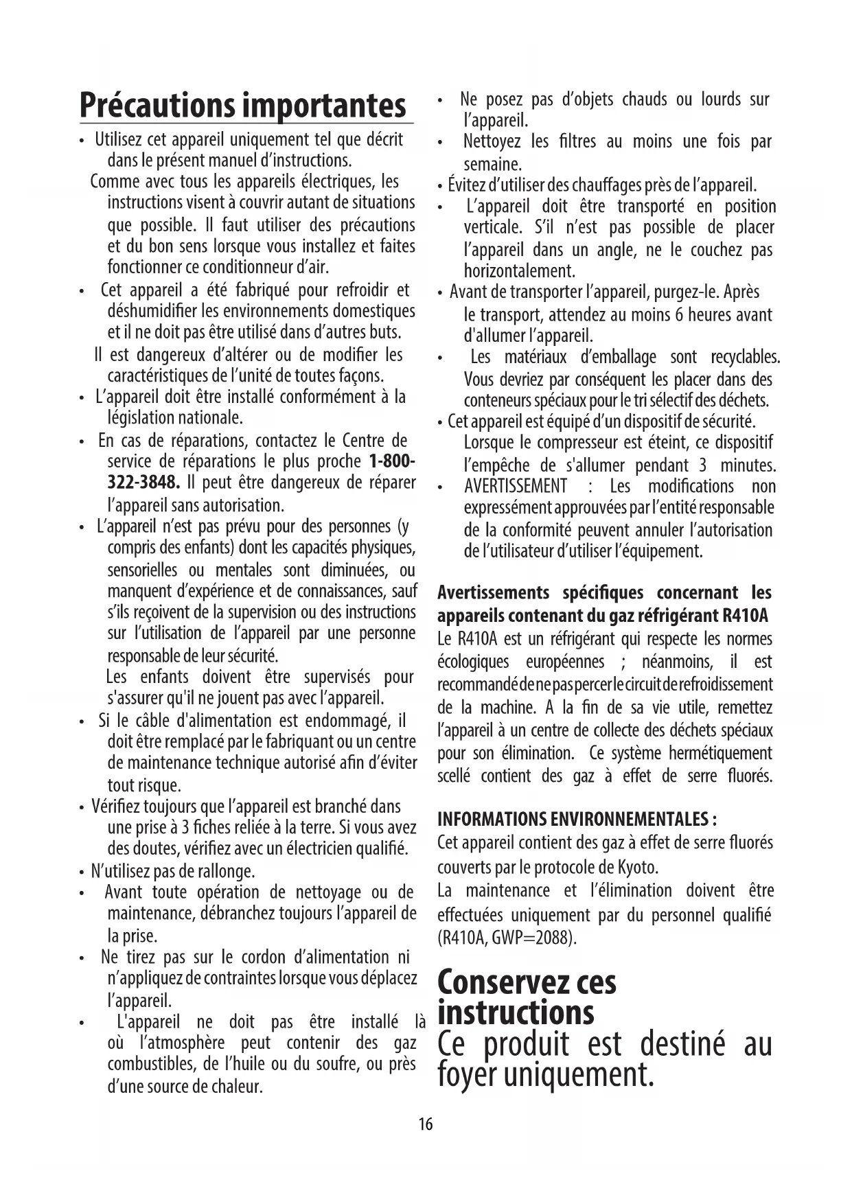 - Utilisez cet appareil uniquement tel que décrit dans le présent manuel d’instructions. Comme avec tous les appareils électriques, les instructions visent à couvrir autant de situations que possible. Il faut utiliser des précautions et du bon sens lorsque vous installez et faites fonctionner ce conditionneur d’air.