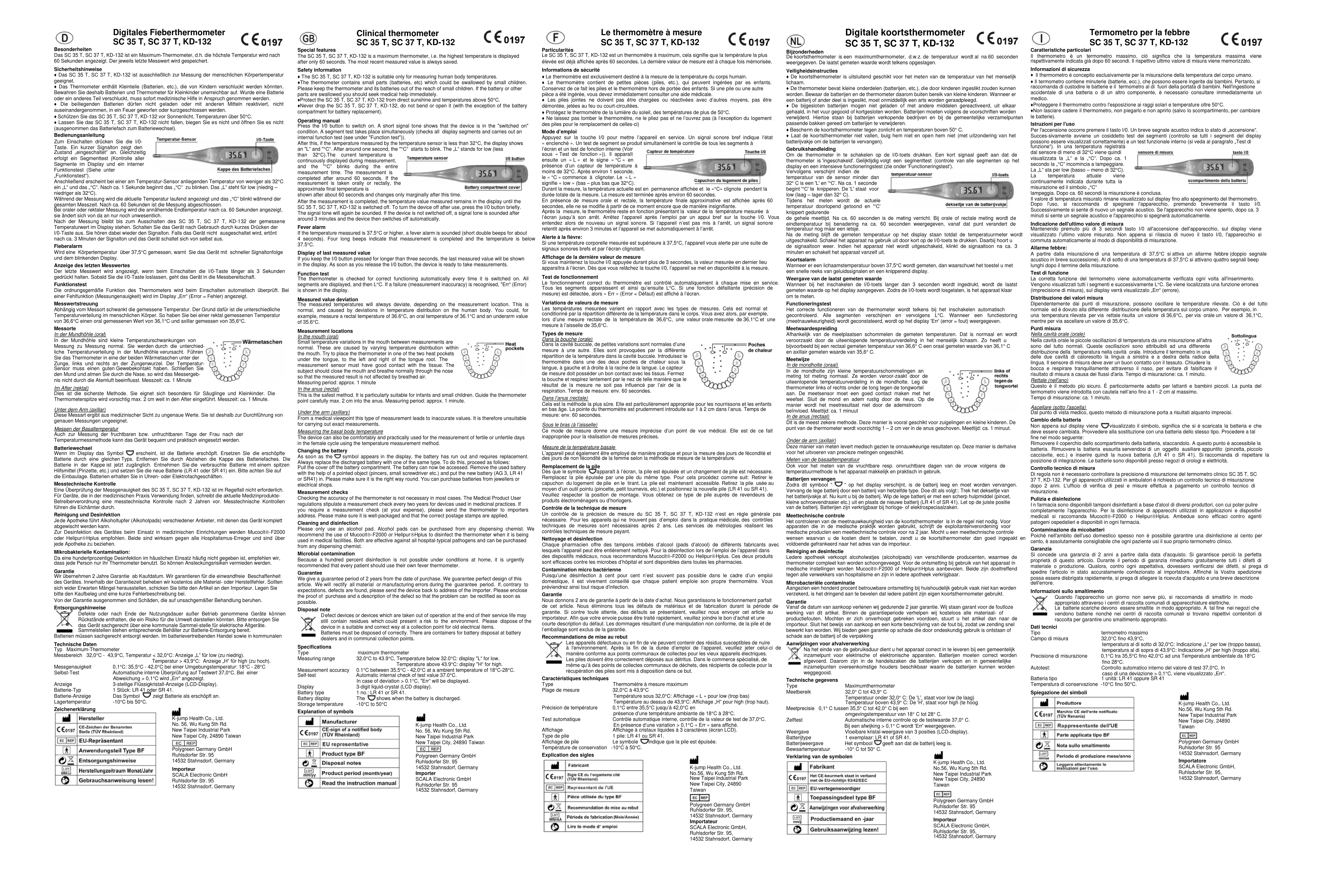 efect devices or devices which are taken out of operation at the end of their service life may still contain residues which could present a risk to the environment. Please dispose of the device in a suitable and correct way at a collection point for old electrical items. Batteries must be disposed of correctly. There are containers for battery disposal at battery dealers and in communal collection points. Specifications Type maximum thermometer Measuring range 32.0°C to 43.9°C, Temperature below 32.0°C: display "L“ for low. Temperature above 43.9°C: display "H“ for high. Measurement accuracy 0.1°C between 35.5°C - 42.0°C at a ambient temperature of 18°C-28°C. Self-test Automatic internal check of test value 37.0°C. In case of deviation > 0.1°C, "Err“ will be displayed. Display 3-digit liquid-crystal (LCD display). Battery type 1 no.: LR 41 or SR 41. Battery display The shows when the battery is discharged. Storage temperature -10°C to 50°C Explanation of symbols K-jump Health Co., Ltd. No. 56, Wu Kung 5th Rd. New Taipei Industrial Park New Taipei City, 24890 Taiwan Polygreen Germany GmbH Ruhlsdorfer Str. 95 14532 Stahnsdorf, Germany Importer SCALA Electronic GmbH Ruhlsdorfer Str. 95 14532 Stahnsdorf, Germany Le thermomètre à mesure SC 35 T, SC 37 T, KD-132 Particularités Le SC 35 T, SC 37 T, KD-132 est un thermomètre à maximum, cela signifie que la température la plus élevée est déjà affichée après 60 secondes. La dernière valeur de mesure est à chaque fois mémorisée. Informations de sécurité ♦ Le thermomètre est exclusivement destiné à la mesure de la température du corps humain. ♦ Le thermomètre contient de petites pièces (piles, etc.), qui peuvent ingérées par es enfants. Conservez de ce fait les piles et le thermomètre hors de portée des enfants. Si une pile ou une autre pièce a été ingérée, vous devez immédiatement consulter une aide médicale. ♦ Les piles jointes ne doivent pas être chargées ou réactivées avec d’autres moyens, pas être démontée, jetées au feu ou court-circuitées. ♦ Protégez le thermomètre de la lumière du soleil, des températures de plus de 50°C. ♦ Ne laissez pas tomber le thermomètre, ne le pliez pas et ne l’ouvrez pas (à l’exception du logement des piles pour le remplacement de celles-ci) Mode d’emploi Appuyez sur la touche I/0 pour mettre l’appareil en service. Un signal sonore bref indique l‘état « enclenché ». Un test de segment se produit simultanément le contrôle de tous les segments à l’écran et un test de fonction interne (Voir sous « Test de fonction »)). Il apparaît ensuite un « L » et le signe « °C » en présence d’un capteur de température à moins de 32°C. Après environ 1 seconde, le « °C » commence à clignoter. Le « L » signifie « low » (bas – plus bas que 32°C). Durant la mesure, la température actuelle est en permanence affichée et le «°C» clignote pendant la durée totale de la mesure. La mesure est terminée après environ 60 secondes. En présence de mesure orale et rectale, la température finale approximative est affichée après 60 secondes, elle ne se modifie à partir de ce moment encore que de manière insignifiante. Après la mesure, le thermomètre reste en fonction présentant la valeur de la température mesurée à l’écran jusqu’à son arrêt. Arrêtez l’appareil après l’emploi par un appui bref sur la touche I/0. Vous entendez alors de nouveau un signal sonore. Si l’appareil n’est pas mis à l’arrêt, un signal sonore retentit après environ 3 minutes et l’appareil se met automatiquement à l’arrêt. Alerte à la fièvre: Si une température corporelle mesurée est supérieure à 37,5°C, l’appareil vous alerte par une suite de signaux sonores brefs et par l’écran clignotant. Affichage de la dernière valeur de mesure