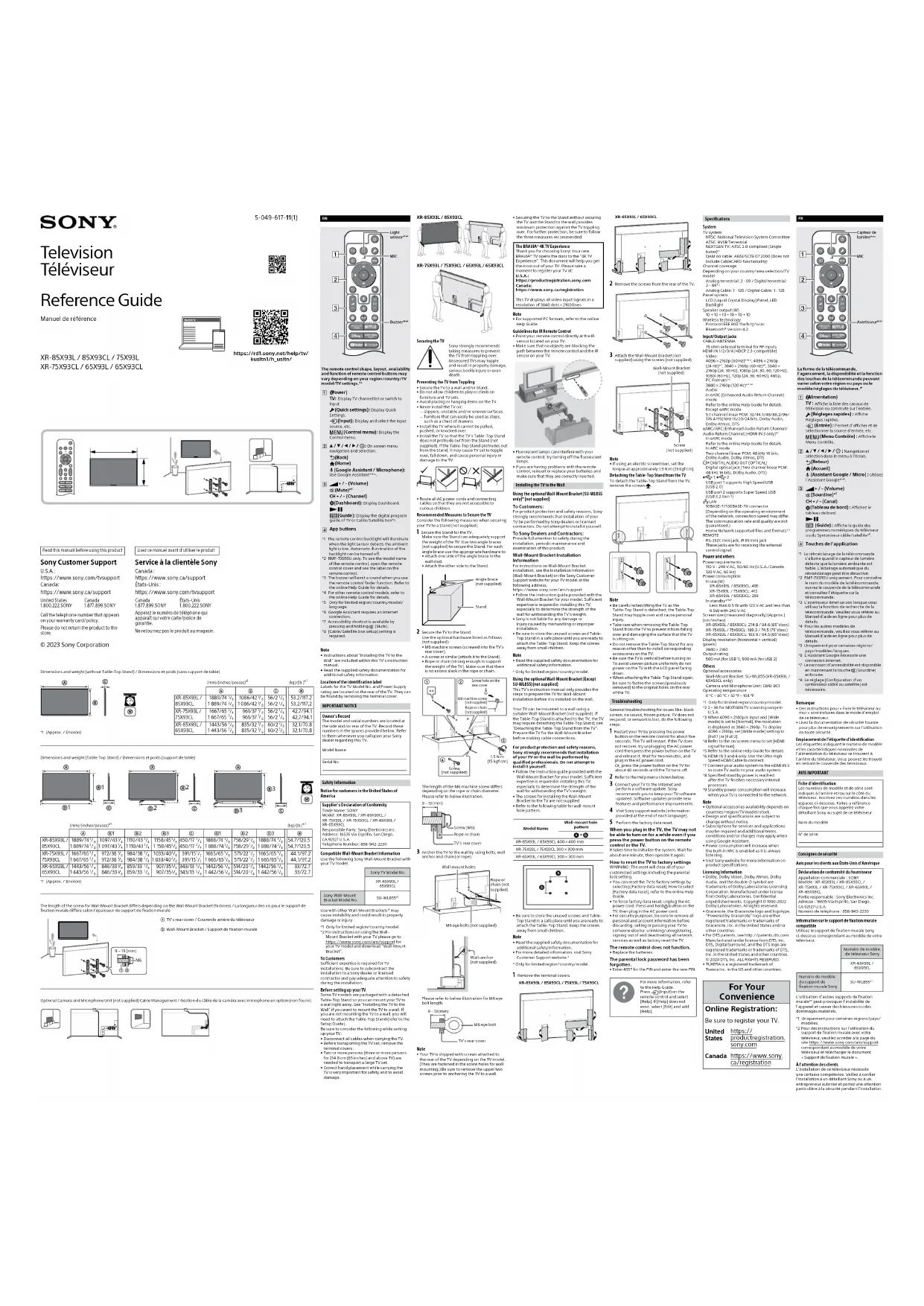 Touches de l’application*1 Le rétroéclairage de la télécommande s’allume quand le capteur de lumière détecte que la lumière ambiante est faible. L’éclairage automatique du rétroéclairage peut être désactivé.*2 RMF-TX910U uniquement. Pour connaître le nom du modèle de la télécommande, ouvrez le couvercle de la télécommande et consultez l’étiquette sur la télécommande.*3 L’avertisseur émet un son lorsque vous utilisez la fonction de recherche de la télécommande. Veuillez vous référer au Manuel d’aide en ligne pour plus de détails.*4 Pour les autres modèles de télécommande, veuillez vous référer au Manuel d’aide en ligne pour plus de détails.*5 Uniquement pour certaines régions/pays/modèles/langues.*6 L’Assistant Google nécessite une connexion Internet.*7 Le raccourci d’accessibilité est disponible en maintenant la touche (Sourdine) enfoncée.*8 Le réglage [Configuration d’un syntoniseur câble ou satellite] est nécessaire.Remarque•Des instructions pour « Fixer le téléviseur au mur » sont incluses dans le mode d’emploi de ce téléviseur.•Lisez la documentation de sécurité fournie pour plus de renseignements sur l’utilisation en toute sécurité.Emplacement de l’étiquette d’identificationLes étiquettes indiquant le numéro de modèle et les caractéristiques nominales de l’alimentation du téléviseur se trouvent à l’arrière du téléviseur. Vous pouvez les trouver en retirant le couvercle des terminaux.AVIS IMPORTANTFiche d’identificationLes numéros de modèle et de série sont indiqués à l’arrière et/ou sur le côté du téléviseur. Inscrivez ces numéros dans les espaces ci-dessous. Faites-y référence chaque fois que vous appelez votre détaillant Sony au sujet de ce téléviseur.Nom du modèleN° de sérieConsignes de sécuritéAvis pour les clients aux États-Unis d’AmériqueDéclaration de conformité du fournisseurAppellation commerciale : SONYModèle : XR-85X93L / XR-85X93CL / XR-75X93L / XR-75X93CL / XR-65X93L / XR-65X93CLPartie responsable : Sony Electronics Inc.Adresse : 16535 Via Esprillo, San Diego, CA 92127 U.S.A.Numéro de téléphone : 858-942-2230Information sur le support de fixation murale compatibleUtilisez le support de fixation murale Sony ci-dessous correspondant au modèle de votre téléviseur.Numéro de modèle de téléviseur SonyXR-65X93L / 65X93CLNuméro de modèle du support de fixation murale SonySU-WL855* L’utilisation d’autres supports de fixation murale* peut provoquer l’instabilité de l’appareil et causer des blessures ou des dommages matériels.*1 Uniquement pour certaines régions/pays/modèles.*2 Pour des instructions sur l’utilisation du support de fixation murale avec votre téléviseur, veuillez accéder à la page du site https://www.sony.com/am/support correspondant au modèle de votre téléviseur et télécharger le document « Support de fixation murale ».À l’attention des clientsL’installation de ce téléviseur nécessite une certaine compétence. Veillez à confier l’installation à un détaillant Sony ou à un entrepreneur autorisé et portez une attention particulière à la sécurité pendant l’installation. © 2023 Sony Corporation Dimensions and weight (without Table-Top Stand) / Dimensions et poids (sans support de table)Dimensions and weight (Table-Top Stand) / Dimensions et poids (support de table) The length of the screw for Wall-Mount Bracket differs depending on the Wall-Mount Bracket thickness / La longueur des vis pour le support de fixation murale diffère selon l’épaisseur du support de fixation murale(mm)/(inches/pouces)* (kg)/(lb.)*