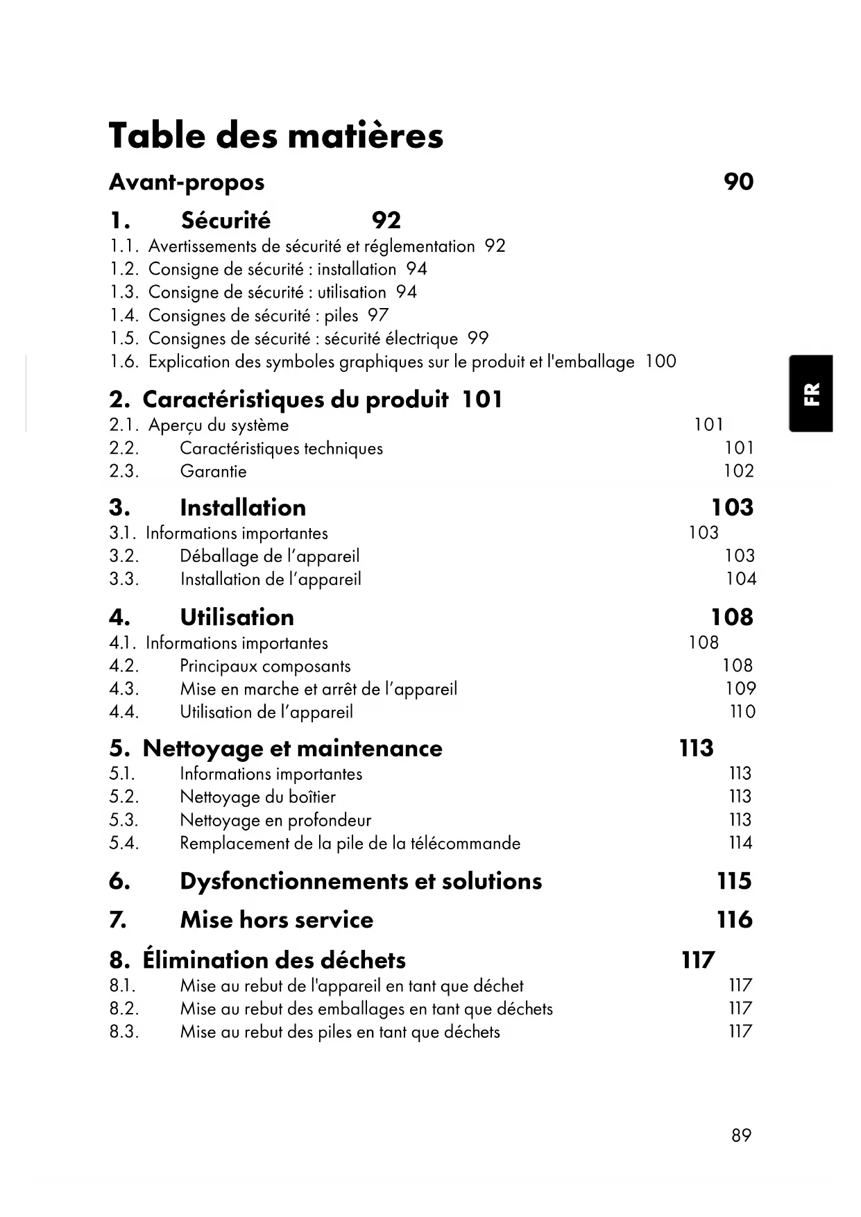1.1. Avertissements de sécurité et réglementation 92 1.2. Consigne de sécurité: installation 94 1.3. Consigne de sécurité: utilisation 94 1.4. Consignes de sécurité : piles 97 1.5. Consignes de sécurité: sécurité électrique 99 1.6. Explication des symboles graphiques sur le produit et l'emballage 100