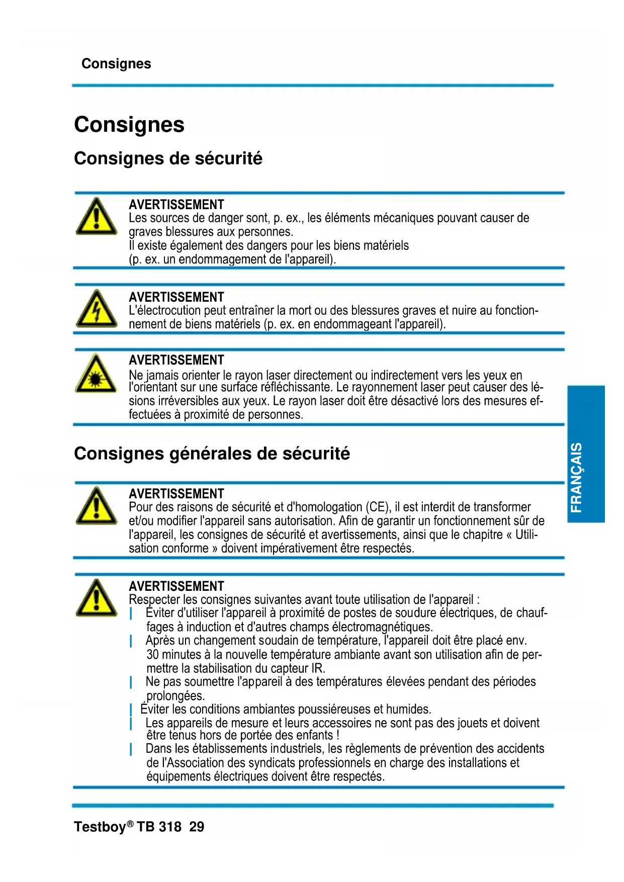 Éviter d'utiliser l'appareil à proximité de postes de soudure électriques, de chauffages à induction et d'autres champs électromagnétiques. 1Après un changement soudain de température, l'appareil doit être placé env. 30 minutes à la nouvelle températureambiante avant son utilisation afin de permettre la stabilisation du capteur IR. Ne pas soumettre l'appareil à des températures élevées pendant des périodes prolongées. Éviter les conditions ambiantes poussiéreuses et humides. Les appareils de mesure et leurs accessoires ne sont pas des jouets et doivent être tenus hors de portée des enfants! Dans les établissements industriels, les règlements de prévention des accidents de l'Association des syndicats professionnels en charge des installations et équipements électriques doivent être respectés.