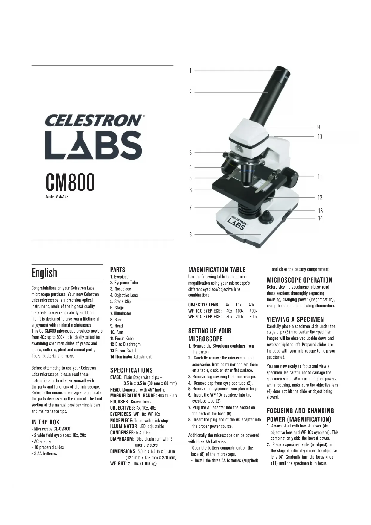 TWO YEAR LIMITED WARRANTY. FOR MORE DETAILED INFORMATION, PLEASE VISIT www.CelestronLabs.com Torrance, CA 90503 TEL (800) 421-9649 www.CelestronLabs.com Copyright 2014 Celestron All rights reserved. (Products or instructions may change without notice or obligation.Designed and intended for those 14 years of age and older.Français Félicitations pour l’acquisition de votre microscope Celestron Labs. Votre microscope est un instrument optique de précision, fabriqué avec des matériaux de la plus grande qualité afin d’assurer sa durabilité et sa longue durée d’utilisation. Il est conçu pour vous offrir une vie entière de découvertes avec un niveau d’entretien minimal. Le microscope CL-CM800 offre des puissances d’agrandissement de 40x à 800x. Il convient parfaitement à l’observation d’échantillons de levures et de moisissures, de cultures, d’éléments végétaux et animaux, de fibres, de bactéries et autres. Avant de commencer à utiliser votre microscope Celestron Labs, lisez ces instructions pour vous familiariser avec les composants et les fonctions du microscope. Référez-vous au schémas du microscope pour repérer les pièces mentionnées dans le présent manuel. La dernière section du mode d’emploi donne des conseils d’entretien et de maintenance faciles à appliquer.