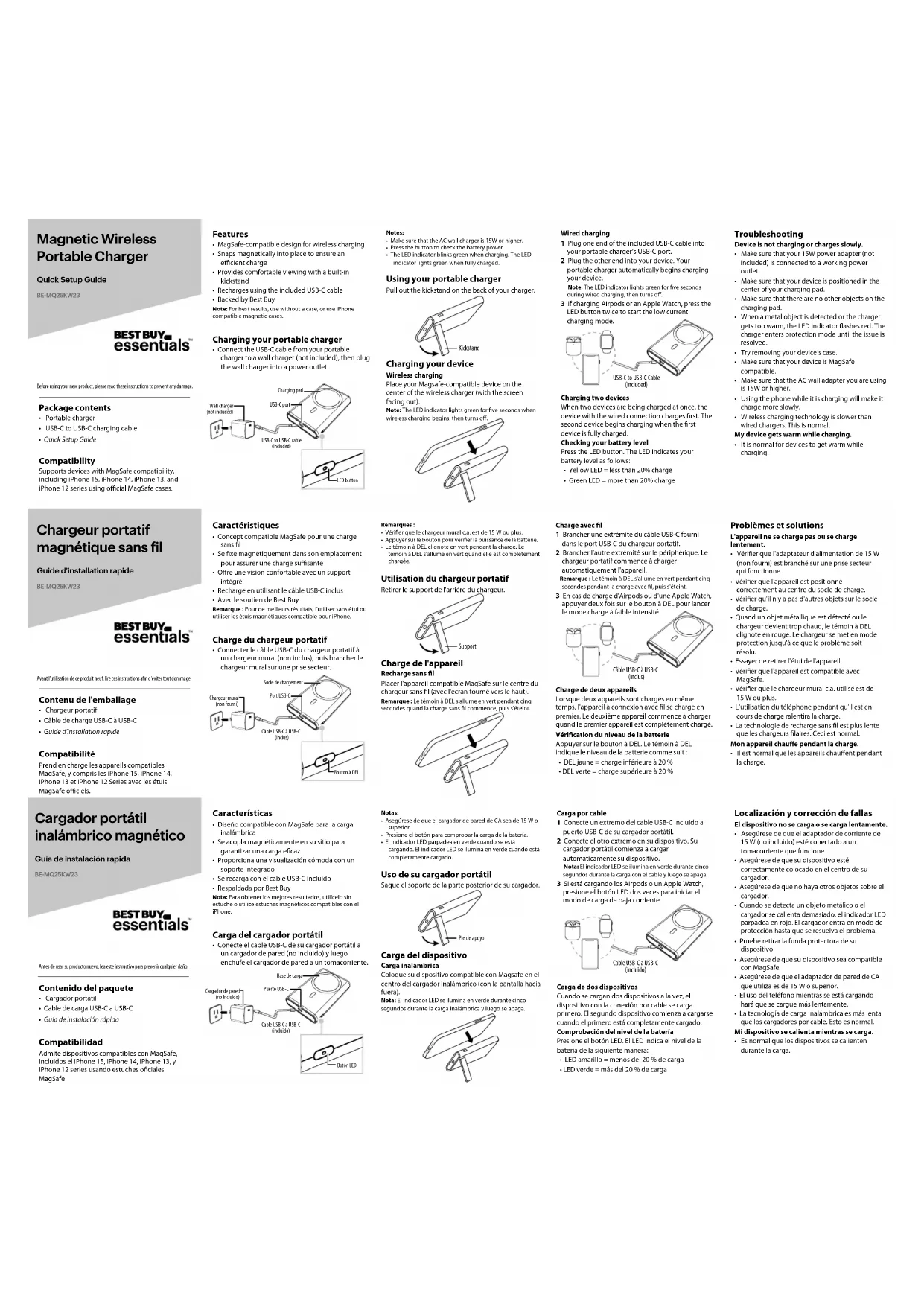qui peuvent provoquer un fonctionnement indésirable de l’appareil. RSS-102 Statement This equipment complies with IC RSS_102 radiation exposure limits set forth for an uncontrolled environment. Cet équipement est conforme aux limites d'exposition aux radiations IC CNR_102 établies pour un environnement non contrôlé. One-year limited warranty Visit www.bestbuy.com/bestbuyessentials for details. Contact Best Buy essentials For customer service, call 1-877-467-4289 (U.S. and Canada) www.bestbuy.com/bestbuyessentials iPhone is a trademark of Apple Inc., registered in the U.S. and other countriesBest Buy essentials is a trademark of Best Buy and its aliated companies.Distributed by Best Buy Purchasing, LLC7601 Penn Ave South, Richeld, MN 55423 U.S.A.©2023 Best Buy. All rights reserved. Caractéristiques Remarque : La capacité de la station d'alimentation sera inférieure à la capacité de la cellule intégrée. La performance peut varier selon les réglages et les conditions environnementales et diminuera avec le temps et en fonction de l'utilisation. Dimensions (H × l × P) 6,8 × 1,5 × 10,3 cm (2,7 × 0,6 × 0,5 po) Poids : 152 g (5,36 oz) Longueur du câble : 30 cm (1 pi) Entrée/sortie UCB-C : 5 V/3 A Sortie de charge sans l : 7,5 W Capacité du chargeur : 5 000 mAh/3,7 V (18,5 Wh) Capacité de sortie : 3 200 mAh (5 V/3 A) Informations sur la sécurité