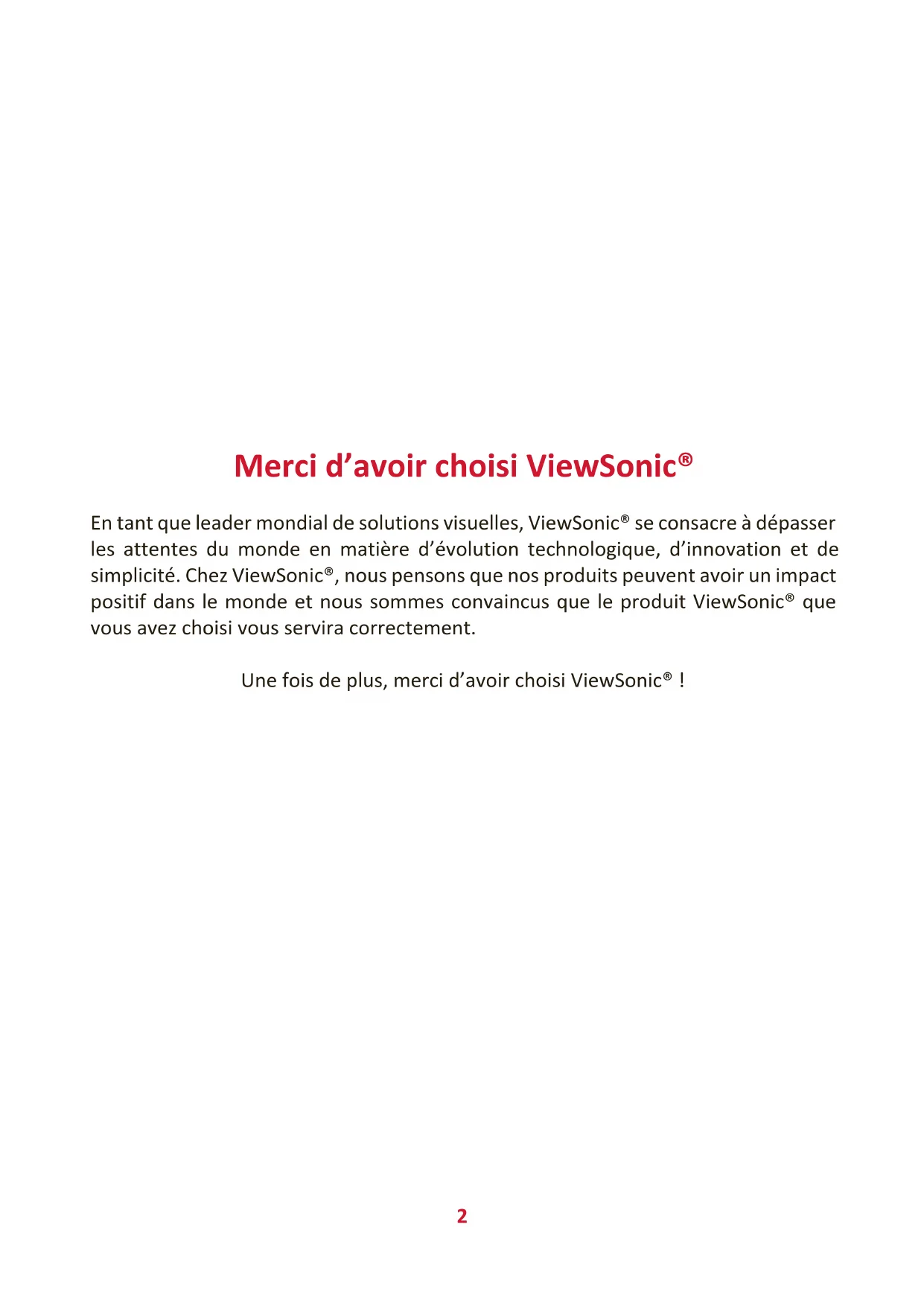 - Réparaon ou tentave de réparaon par une personne non autorisée par ViewSonic®. Eet de la loi d’État : Cee garane vous donne des droits légaux spéciques et vous pouvez également avoir d’autres droits, variant d’un état à l’autre. Certains états n’autorisent pas les limitaons sur les garanes implicites et/ou n’autorisent pas l’exclusion des dommages indirects ou consécufs, par conséquent les limitaons et exclusions menonnées ci-dessus peuvent ne pas s’appliquer à vous. Ventes hors des États-Unis et du Canada : Pour des informaons et des services de garane sur les produits ViewSonic® vendus hors des États-Unis et du Canada, veuillez contacter ViewSonic® ou votre revendeur ViewSonic® local. La période de garane de ce produit en Chine connentale (Hong Kong, Macao et Taïwan exclus) est soumise aux termes de la Carte de Garane et de Maintenance. Pour les ulisateurs en Europe et en Russie, vous trouverez plus d’informaons sur la garane sur : hp://www.viewsonic.com/eu/ under dans la secon « Informaons sur le support/garane ».