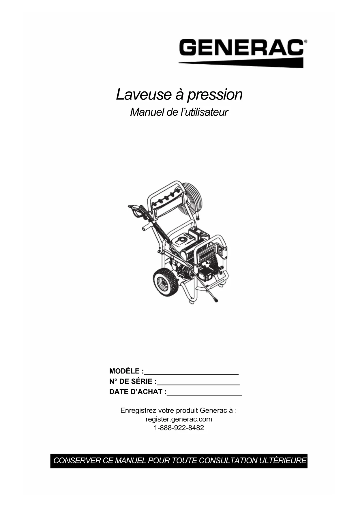 Notes20 Manuel de l’utilisateur de la laveuse à pression NotesManuel de l’utilisateur de la laveuse à pression 21 NotesRéf. 0K8031 Rév. D 19/01/2021 ©2021 Generac Power Systems, Inc. Tous droits réservés Les spécifications sont sujettes à modification sans préavis. Aucune forme de reproduction n’est autorisée sans le consentement écrit préalable de Generac Power Systems, Inc. Generac Power Systems, Inc. S45 W29290 Hwy. 59 Waukesha, WI 53189 1-888-GENERAC (1-888-436-3722) www.generac.com