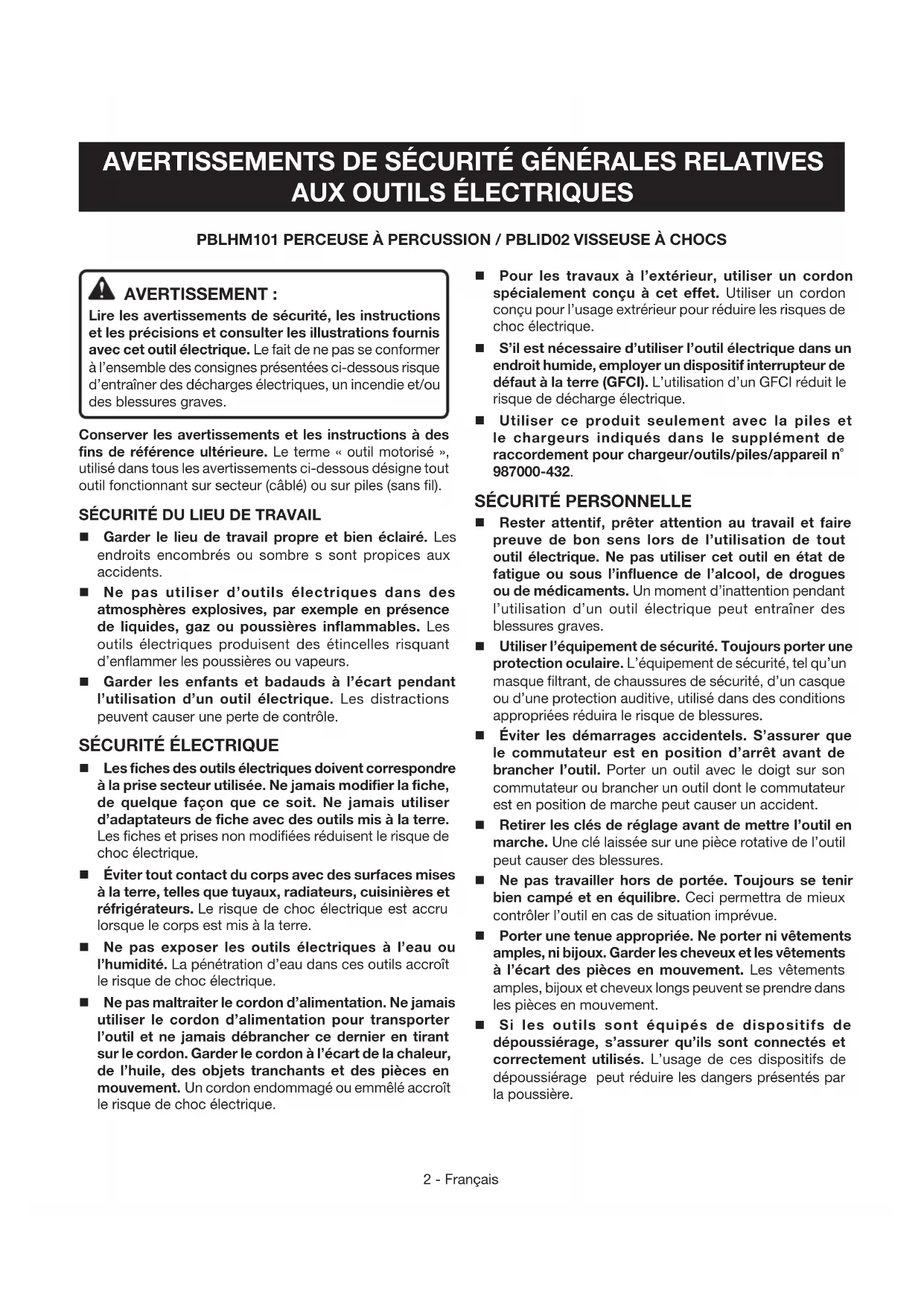 APPLICATIONS Cet outil ne doit être utilisé que pour les applications listées ci-dessous. PBLHM101 Perçage en mode de percussion dans le béton, la brique et autres pièces de maçonnerie Perçage et du vissage de vis de produits du bois (bois d’oeuvre, contreplaqué, lambris, aggloméré et bois dur), céramique, plastique, fibre de verre, matériaux laminés, métaux mous et durs; Visser différents types de vis dans le bois et les cloisons sèches à l’aide d’embouts de tournevis PBLID02 Enfoncement de vis longues pour la construction d’une terrasse en bois; enfoncement de boulons traversant dans les montants de la terrasse; enfoncement de vis Tapcon