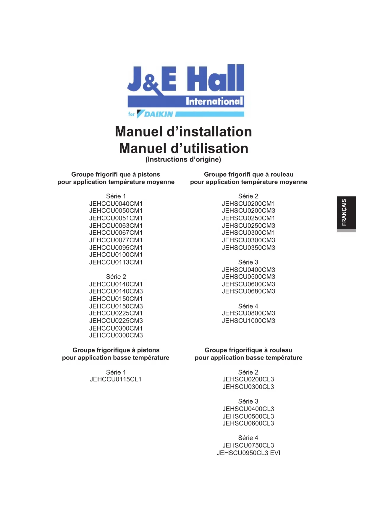 DEUTSCHGroupe frigorifi que à rouleau pour application température moyenne Groupe frigorifi que à pistons pour application température moyenne Série 1 JEHCCU0040CM1 JEHCCU0050CM1 JEHCCU0051CM1 JEHCCU0063CM1 JEHCCU0067CM1 JEHCCU0077CM1 JEHCCU0095CM1 JEHCCU0100CM1 JEHCCU0113CM1 Série 2 JEHCCU0140CM1 JEHCCU0140CM3 JEHCCU0150CM1 JEHCCU0150CM3 JEHCCU0225CM1 JEHCCU0225CM3 JEHCCU0300CM1 JEHCCU0300CM3 Groupe frigorifique à pistons pour application basse température Série 1 JEHCCU0115CL1 Série 2 JEHSCU0200CM1 JEHSCU0200CM3 JEHSCU0250CM1 JEHSCU0250CM3 JEHSCU0300CM1 JEHSCU0300CM3 JEHSCU0350CM3 Série 3 JEHSCU0400CM3 JEHSCU0500CM3 JEHSCU0600CM3 JEHSCU0680CM3 Série 4 JEHSCU0800CM3 JEHSCU1000CM3 Groupe frigorifique à rouleau pour application basse température Série 2 JEHSCU0200CL3 JEHSCU0300CL3 Série 3 JEHSCU0400C