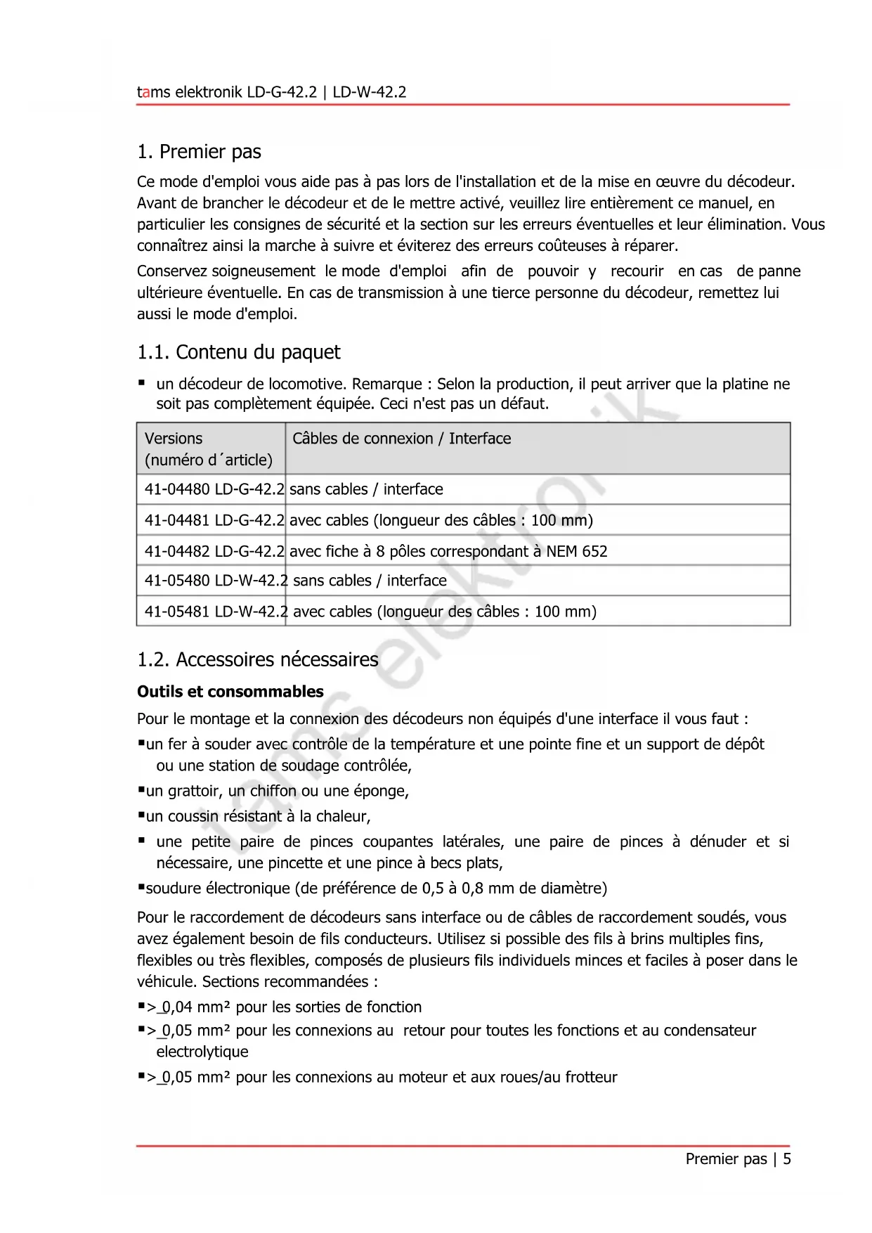 3.1. Conseils concernant la sécurité 22 3.2. Pour réussir vos soudures 23 3.3. Eviter les dommages irréparables sur le décodeur 24 3.4. Connexions LD-G-42.2 25 3.5. Connexions LD-W-42.2 26 3.6. Monter des décodeurs avec interface 27 3.7. Utilisation du LD-G-42.2 dans des locomotives à moteur à CA. 27 3.8. Monter des décodeurs sans interface 28
