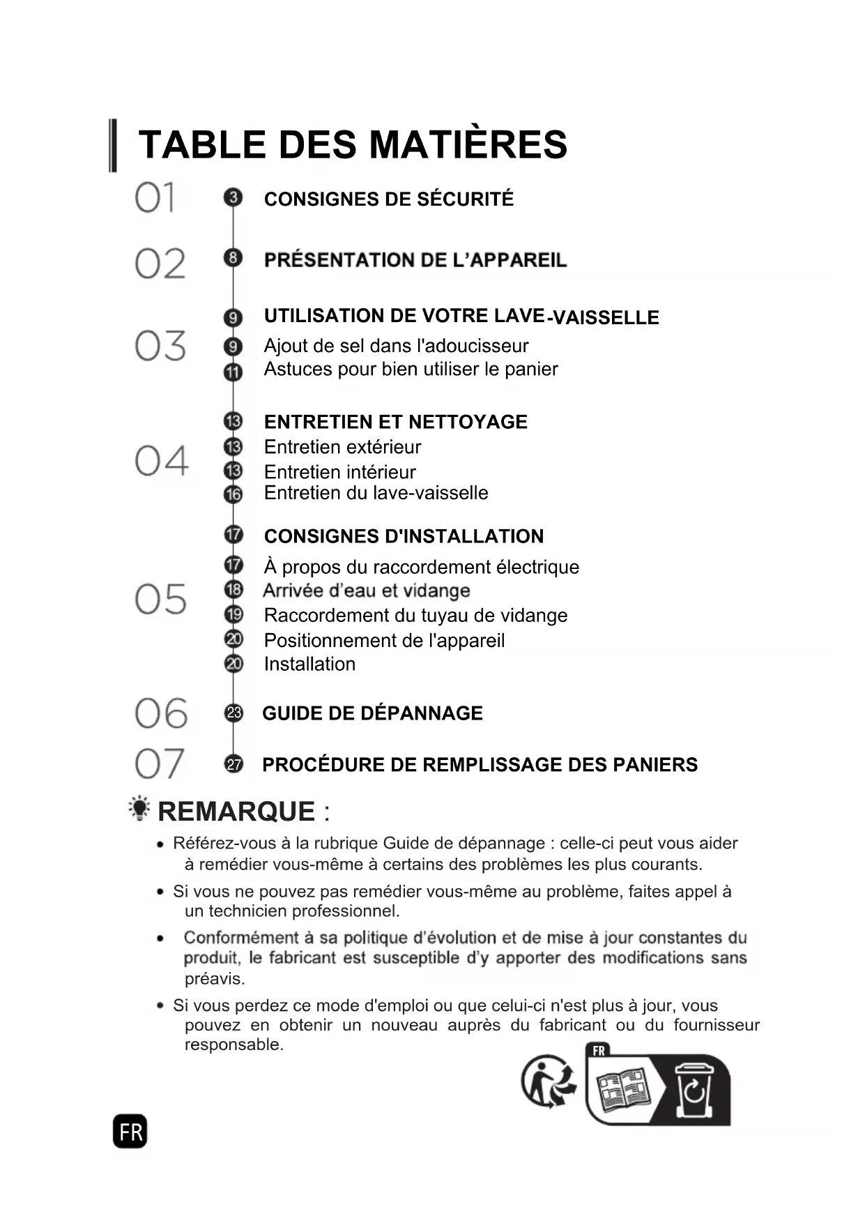 REMARQUE : Référez-vous à la rubrique Guide de dépannage : celle-ci peut vous aider à remédier vous-même à certains des problèmes les plus courants. Si vous ne pouvez pas remédier vous-même au problème, faites appel à un technicien professionnel. préavis. Si vous perdez ce mode d'emploi ou que celui-ci n'est plus à jour, vous pouvez en obtenir un nouveau auprès du fabricant ou du fournisseur responsable.CONSIGNES DE SÉCURITÉ