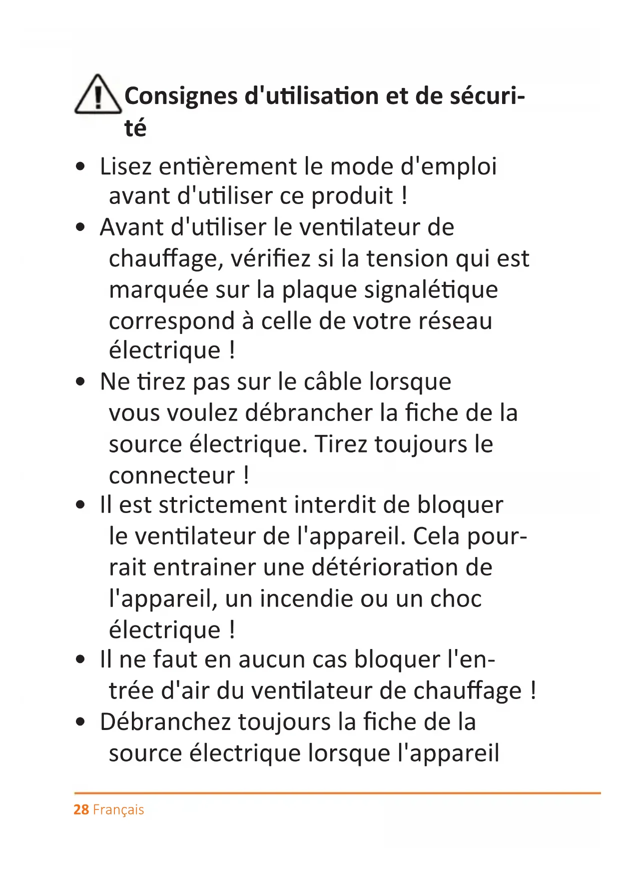 - Débranchez toujours la che de la source électrique lorsque l'appareil29Français n'est pas en service ! Ne laissez ja- mais le venlateur de chauage sans surveillance !