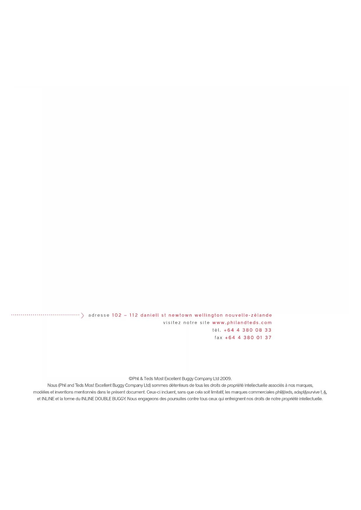 - Les consommateurs peuvent bénéficier de droits supplémen- taires dans certains pays ou états. Nos produits sont garantis contre les défauts matériels et de fabrication durant un an à partir de la date d’achat. Si le produit présentait un défaut de fabrication, nous le réparerions gratuitement et, à notre discrétion, nous pourrions remplacer la pièce défectueuse. Si le produit s’avérait défectueux à la suite d’une négligence ou d’une mauvaise utilisation, celui-ci ne pourrait être couvert par la garantie mais nous serions heureux de le réparer à un moindre coût.* Qui est couvert? L’acheteur initial ayant fait l’acquisition du produit auprès d’un revendeur agréé. Une preuve d’achat sera exigée. Qu’est ce qui est couvert? Les défauts matériels ou de fabrication, sous réserve que le peanut ait été utilisé dans des conditions normales, conformément aux explications de la notice, et convenablement entretenu. Qu’est ce qui n’est pas couvert? Les produits d’occasion, ayant subi des modifications, une altération volontaire du tissu et un usage anormal ou inapproprié. Egalement, le non respect des conseils d’utilisation, la non surveillance de l’enfant, une charge excessive, des dommages causés par le transport (aérien ou autre). Coûts à la charge du client dans le cadre de la garantie. Le consommateur prendra à sa charge tous les coûts de transport liés au retour du produit auprès de l’usine ou du revendeur. Coûts à la charge du client en dehors de la garantie. Dans le cas où la preuve d’achat ne peut être fournie ou que la date de fin de garantie est dépassée, le fabricant (ou son distributeur) se réserve le droit de facturer la réparation ou le changement des pièces défectueuses. Les frais de transport pourront également être à la charge du client. Exclusion: Toute perte où dommage causé sur une personne ou un bien matériel résultant, directement ou indirectement, de l’utilisation du produit. Qui dois-je contacter? Toute demande doit être effectuée auprès du magasin revendeur. Une preuve d’achat vous sera demandée au moment de la prise en charge. Les produits renvoyés directement au fabricant par le consommateur ne pourront PAS être pris sous garantie. Enregistrez-vous & détendez- vous Pour valider votre garantie, veuillez enregistrer votre produit sur notre site: www.philandteds.com françaispeanut