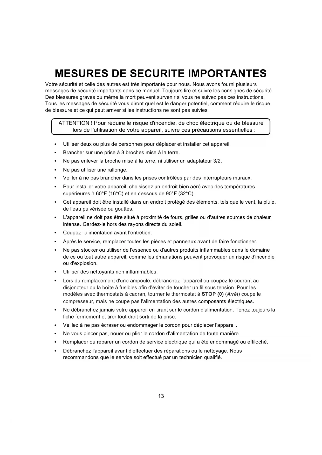 Votre sécurité et celle des autres est très importante pour nous. Nous avons fourni plusieurs messages de sécurité importants dans ce manuel. Toujours lire et suivre les consignes de sécurité. Des blessures graves ou même la mort peuvent survenir si vous ne suivez pas ces instructions. Tous les messages de sécurité vous diront quel est le danger potentiel, comment réduire le risque de blessure et ce qui peut arriver si les instructions ne sont pas suivies. ATTENTION ! Pour réduire le risque d'incendie, de choc électrique ou de blessure lors de l'utilisation de votre appareil, suivre ces précautions essentielles :