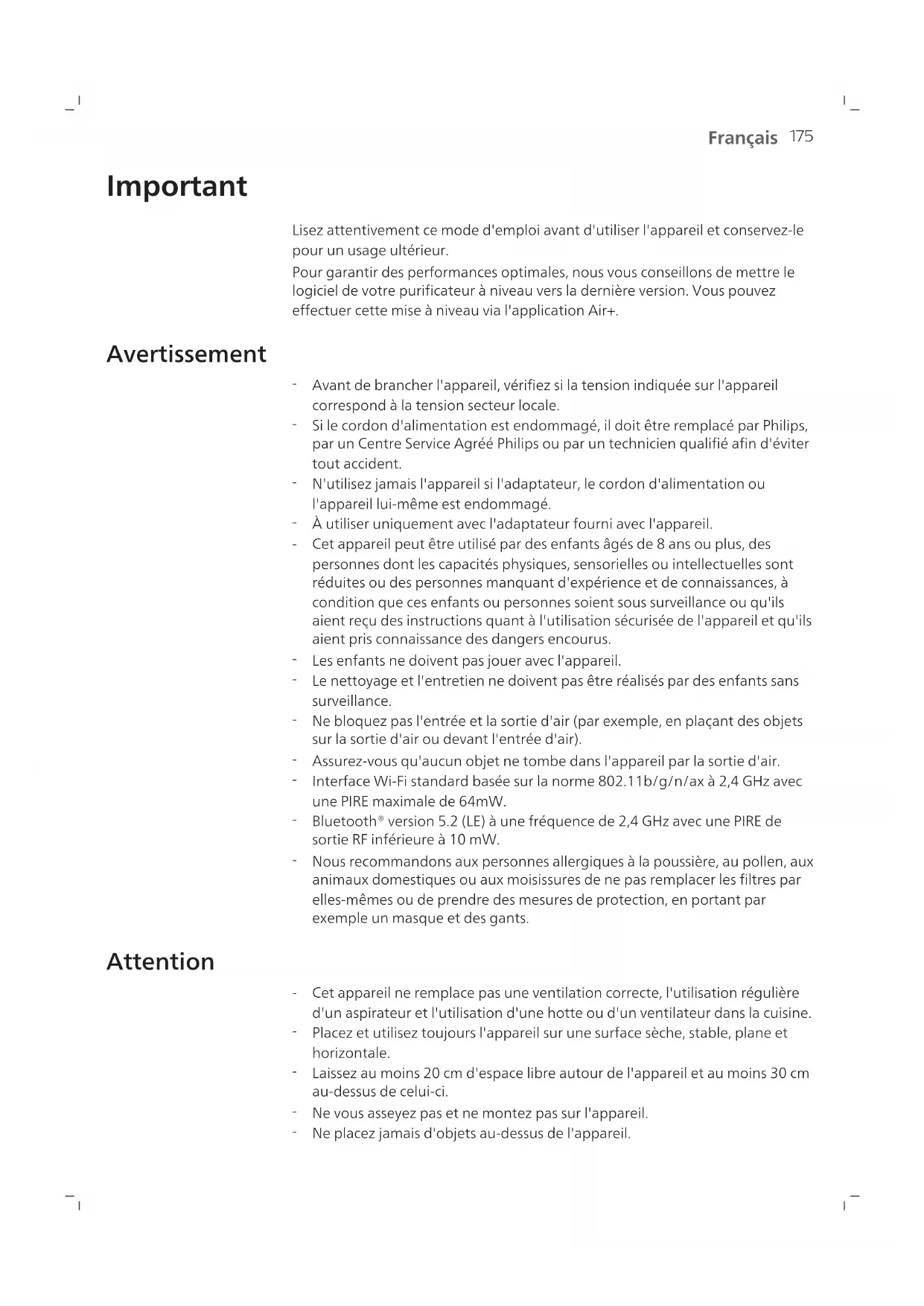 Français Important Lisez attentivement ce mode d'emploi avant d'utiliser l'appareil et conservez-le pour un usage ultérieur. Pour garantir des performances optimales, nous vous conseillons de mettre le logiciel de votre purificateur à niveau vers la dernière version. Vous pouvez effectuer cette mise à niveau via l'application Air+. Avertissement