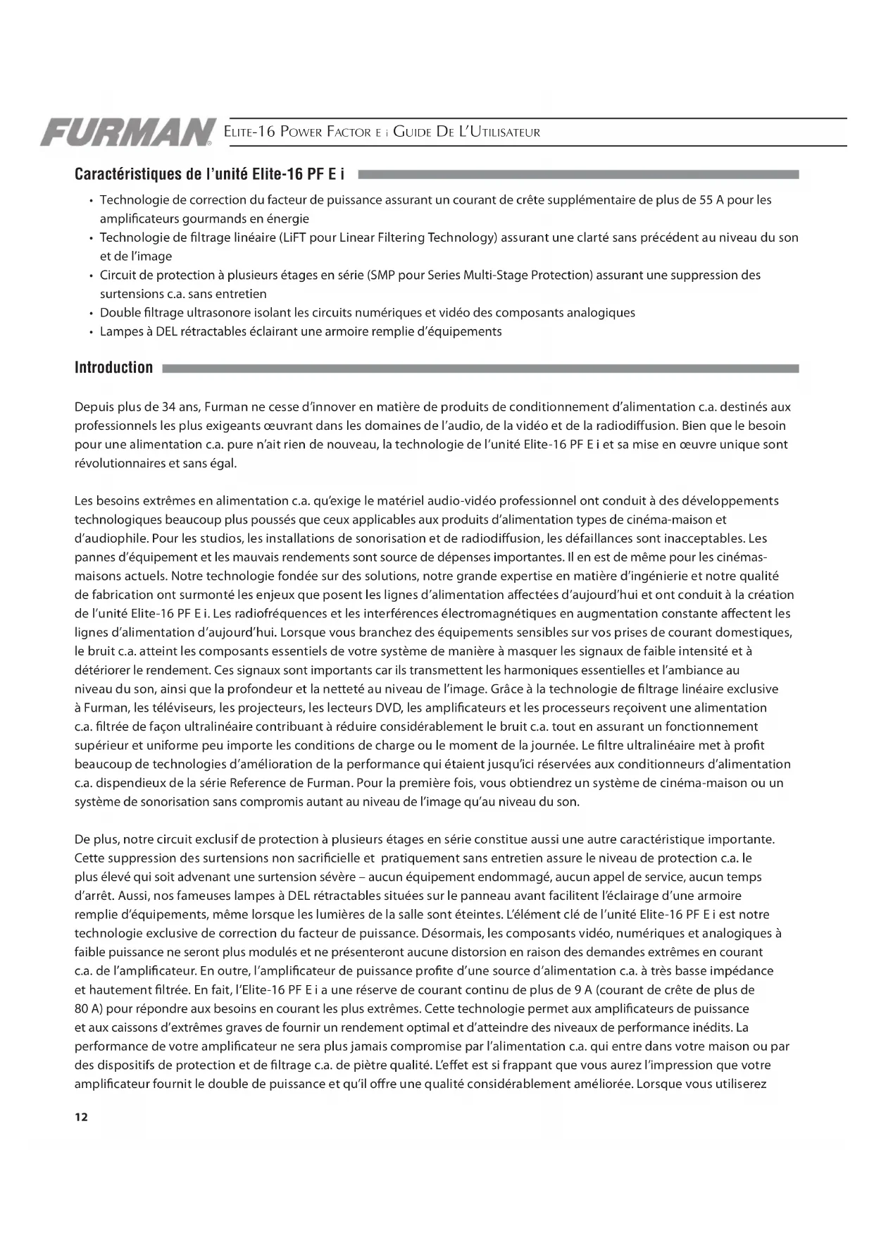 Caractéristiques de l’unité Elite-16 PF E i Technologie de correction du facteur de puissance assurant un courant de crête supplémentaire de plus de 55 A pour les amplicateurs gourmands en énergie Technologie de ltrage linéaire (LiFT pour Linear Filtering Technology) assurant une clarté sans précédent au niveau du son et de l’image Circuit de protection à plusieurs étages en série (SMP pour Series Multi-Stage Protection) assurant une suppression des surtensions c.a. sans entretien Double ltrage ultrasonore isolant les circuits numériques et vidéo des composants analogiques Lampes à DEL rétractables éclairant une armoire remplie d’équipements Introduction Depuis plus de 34 ans, Furman ne cesse d’innover en matière de produits de conditionnement d’alimentation c.a. destinés aux professionnels les plus exigeants œuvrant dans les domaines de l’audio, de la vidéo et de la radiodiusion. Bien que le besoin pour une alimentation c.a. pure n’ait rien de nouveau, la technologie de l’unité Elite-16 PF E i et sa mise en œuvre unique sont révolutionnaires et sans égal. Les besoins extrêmes en alimentation c.a. qu’exige le matériel audio-vidéo professionnel ont conduit à des développements technologiques beaucoup plus poussés que ceux applicables aux produits d’alimentation types de cinéma-maison et d’audiophile. Pour les studios, les installations de sonorisation et de radiodiusion, les défaillances sont inacceptables. Les pannes d’équipement et les mauvais rendements sont source de dépenses importantes. Il en est de même pour les cinémas- maisons actuels. Notre technologie fondée sur des solutions, notre grande expertise en matière d’ingénierie et notre qualité de fabrication ont surmonté les enjeux que posent les lignes d’alimentation aectées d’aujourd’hui et ont conduit à la création de l’unité Elite-16 PF E i. Les radiofréquences et les interférences électromagnétiques en augmentation constante aectent les lignes d’alimentation d’aujourd’hui. Lorsque vous branchez des équipements sensibles sur vos prises de courant domestiques, le bruit c.a. atteint les composants essentiels de votre système de manière à masquer les signaux de faible intensité et à détériorer le rendement. Ces signaux sont importants car ils transmettent les harmoniques essentielles et l’ambiance au niveau du son, ainsi que la profondeur et la netteté au niveau de l’image. Grâce à la technologie de ltrage linéaire exclusive à Furman, les téléviseurs, les projecteurs, les lecteurs DVD, les amplicateurs et les processeurs reçoivent une alimentation c.a. ltrée de façon ultralinéaire contribuant à réduire considérablement le bruit c.a. tout en assurant un fonctionnement supérieur et uniforme peu importe les conditions de charge ou le moment de la journée. Le ltre ultralinéaire met à prot beaucoup de technologies d’amélioration de la performance qui étaient jusqu’ici réservées aux conditionneurs d’alimentation c.a. dispendieux de la série Reference de Furman. Pour la première fois, vous obtiendrez un système de cinéma-maison ou un système de sonorisation sans compromis autant au niveau de l’image qu’au niveau du son. De plus, notre circuit exclusif de protection à plusieurs étages en série constitue aussi une autre caractéristique importante. Cette suppression des surtensions non sacricielle et pratiquement sans entretien assure le niveau de protection c.a. le plus élevé qui soit advenant une surtension sévère – aucun équipement endommagé, aucun appel de service, aucun temps d’arrêt. Aussi, nos fameuses lampes à DEL rétractables situées sur le panneau avant facilitent l’éclairage d’une armoire remplie d’équipements, même lorsque les lumières de la salle sont éteintes. L’élément clé de l’unité Elite-16 PF E i est notre technologie exclusive de correction du facteur de puissance. Désormais, les composants vidéo, numériques et analogiques à faible puissance ne seront plus modulés et ne présenteront aucune distorsion en raison des demandes extrêmes en courant c.a. de l’amplicateur. En outre, l’amplicateur de puissance prote d’une source d’alimentation c.a. à très basse impédance et hautement ltrée. En fait, l’Elite-16 PF E i a une réserve de courant continu de plus de 9 A (courant de crête de plus de 80 A) pour répondre aux besoins en courant les plus extrêmes. Cette technologie permet aux amplicateurs de puissance et aux caissons d’extrêmes graves de fournir un rendement optimal et d’atteindre des niveaux de performance inédits. La performance de votre amplicateur ne sera plus jamais compromise par l’alimentation c.a. qui entre dans votre maison ou par des dispositifs de protection et de ltrage c.a. de piètre qualité. L’eet est si frappant que vous aurez l’impression que votre amplicateur fournit le double de puissance et qu’il ore une qualité considérablement améliorée. Lorsque vous utiliserez
