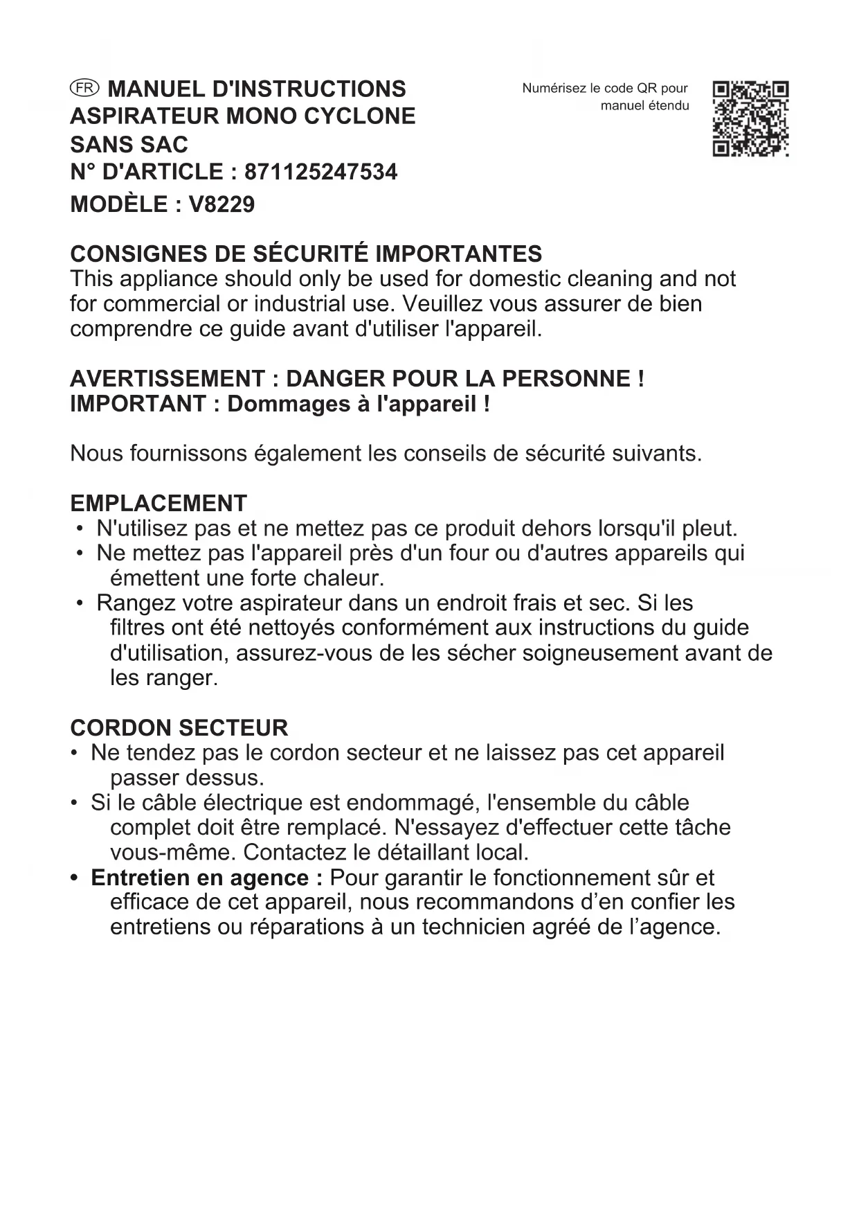 - Entretien en agence : Pour garantir le fonctionnement sûr et efcace de cet appareil, nous recommandons d’en coner les entretiens ou réparations à un technicien agréé de l’agence. Numérisez le code QR pour manuel étenduENFANTS